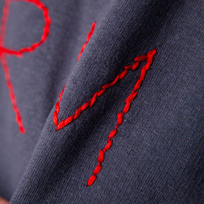 クルーネックとパンツには、手刺しゅうのような温度感を持つロゴをワンポイントで。