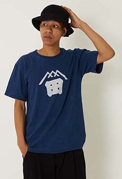 田の文字の上にある山のかんむりには、山のカタチに盛り上げたもの、物事の多くが積み重なっている事、物事の絶頂、万一の幸いを願っている事、などの意味があり、商売によって家が発展しその絶頂を極めたいという思いが込められていると言われています。インディゴ染のTシャツに抜染で表現しました。