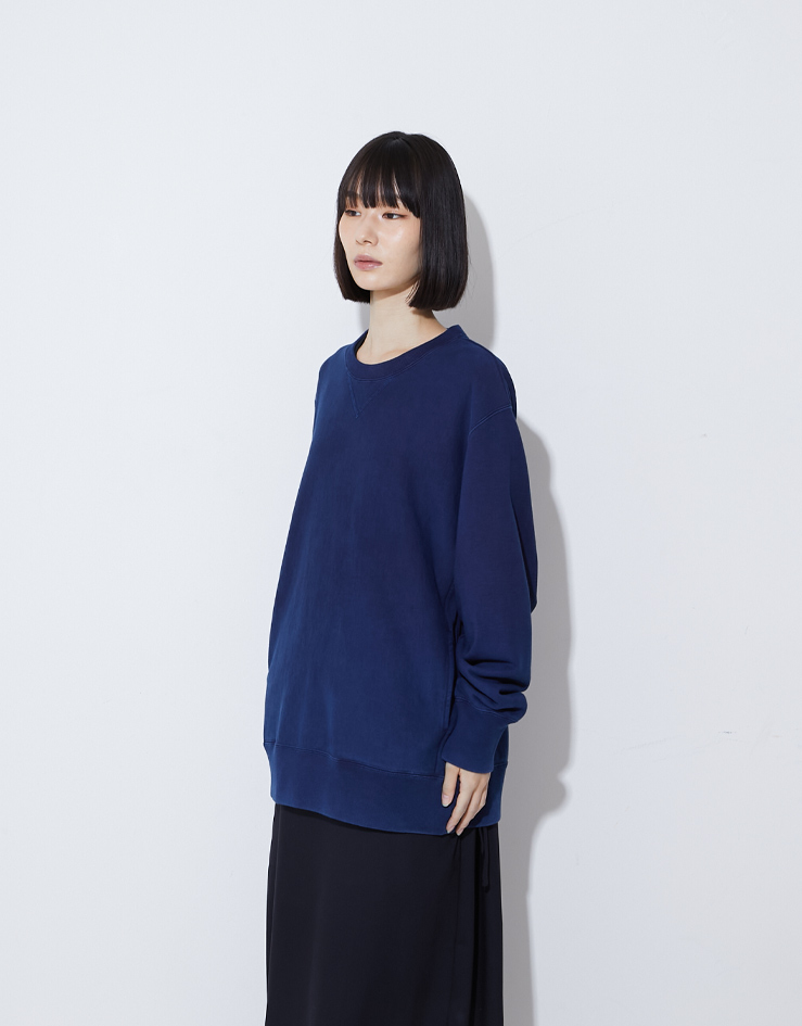 同素材のクルーネック スウェットシャツ(1004368)と同じサイズ感になります。生地の厚みを活かした、しっかりと立つフードがポイントです。 一つ一つ手作業によりインディゴに染められ、インディゴの深い色合いと経年変化を存分に味わって頂けます。