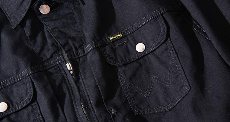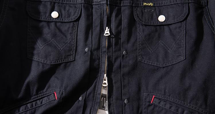 Wranglerを代表するトラッカージャケットの名品「24MJZ」をベースにヨウジヤマモト社定番のブラックカツラギで仕立てた1着。
