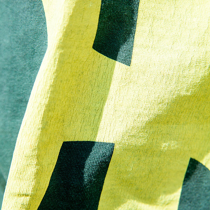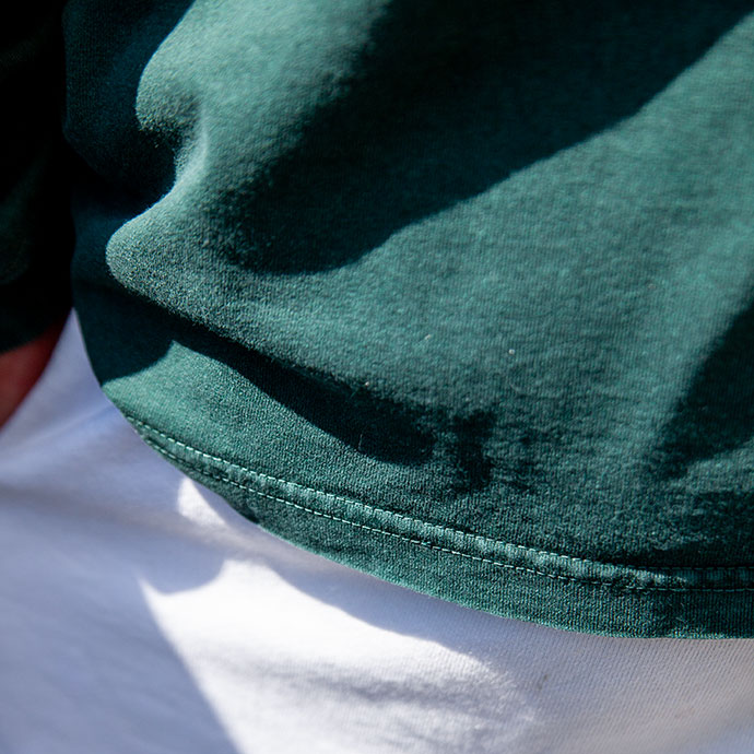 通常空紡糸はドライタッチで硬い印象となりますが、超長綿を使用することでドライタッチで表面感ある風合いを活かしつつしなやかで柔らかさのあるヘヴィーウェイト天竺に仕上がります。