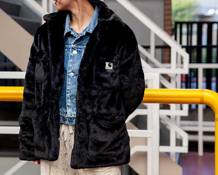 ナイロン製の裏地と厚手のフェイクファーを使用した「ウィメンズ オルニーミシガンコート」は、ふんわりとした暖かさと存在感のあるデザインが魅力。店頭でも好評の一着です。