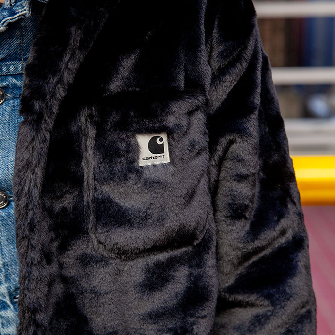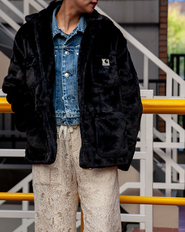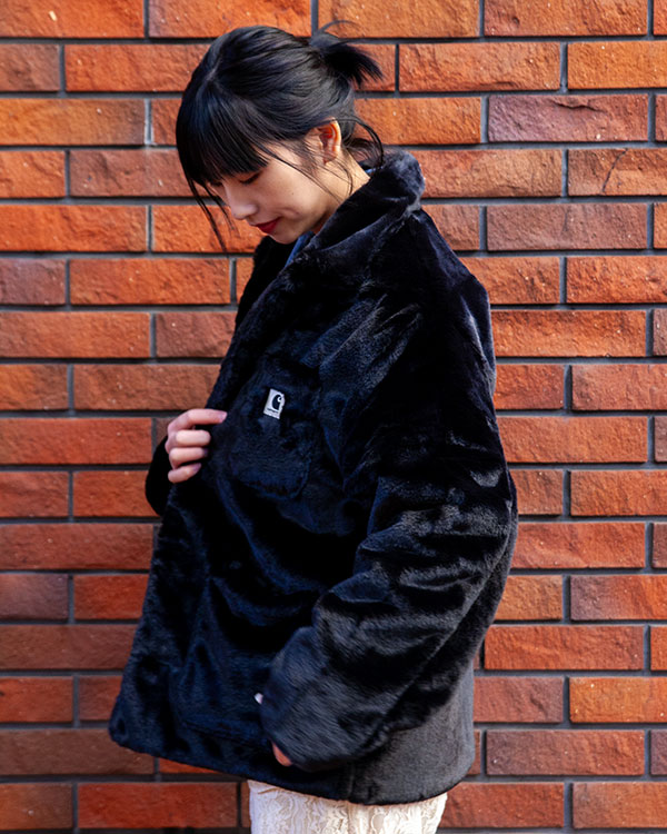 フロントには4つのポケットを備え、ミシガンコートらしい実用性はそのままに、表面を覆うフェイクファーがやさしいムードを添えています。