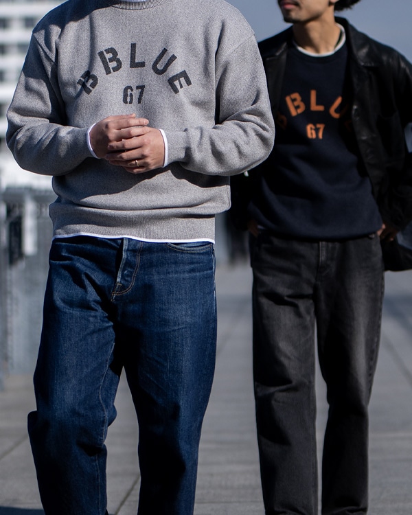 B BLUE 67ロゴをニットの編み柄で表現したスウェットライクなコットンセーターです。