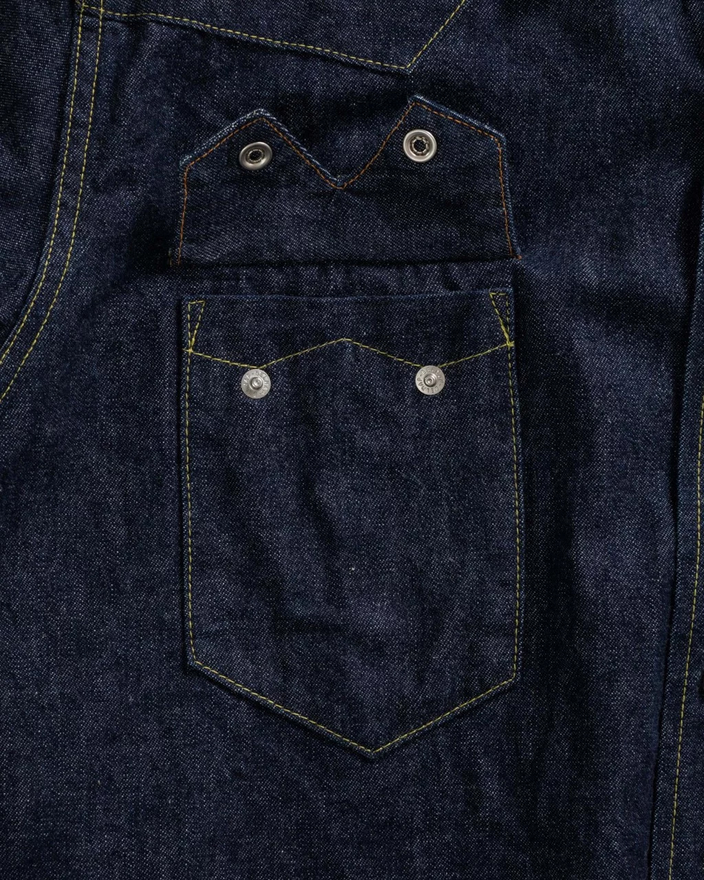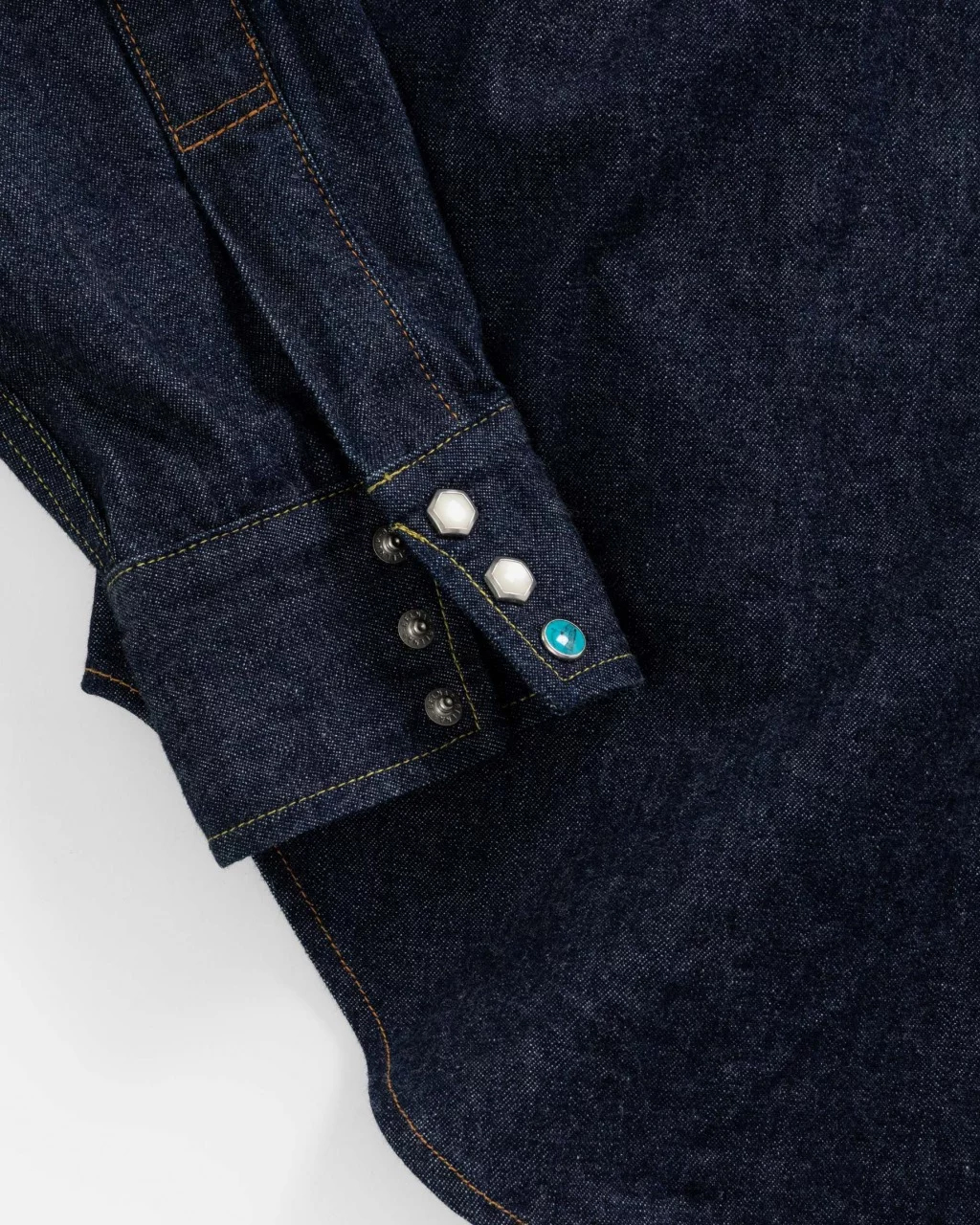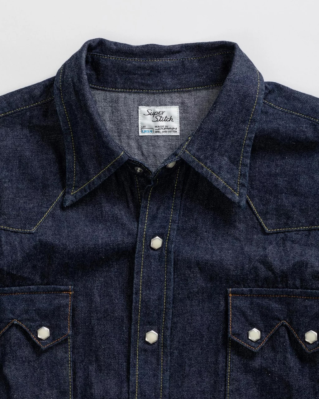 最大の特徴は、一般的なシングルポイントではなく、より希少でモダンな印象を与える「ダブルポイント」のポケットフラップです。10ozのインディゴデニムを使用し、八角形の白蝶貝スナップボタンや、カフスにランダムに配置されたターコイズボタンなど、遊び心あるディテールを注入。高密度のステッチワークやチェーンステッチを駆使し、ヴィンテージの魂と現代的な感性を融合させた、Superstitch初のデニムシャツです。