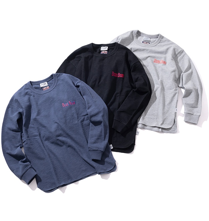 柔らかく軽い着心地が魅力のインレー素材。肌当たりの良いループ状の編地が特徴。胸元にBLUE BLUEのロゴ刺繍をあしらい、シンプルながら存在感のあるアクセントに。スウェットほど厚すぎず、Tシャツ感覚で着用できる1着。1枚で着てもシャツやジャケットのインナーとしても活躍する万能アイテム。性別問わずデイリーに取り入れやすいアイテムです。