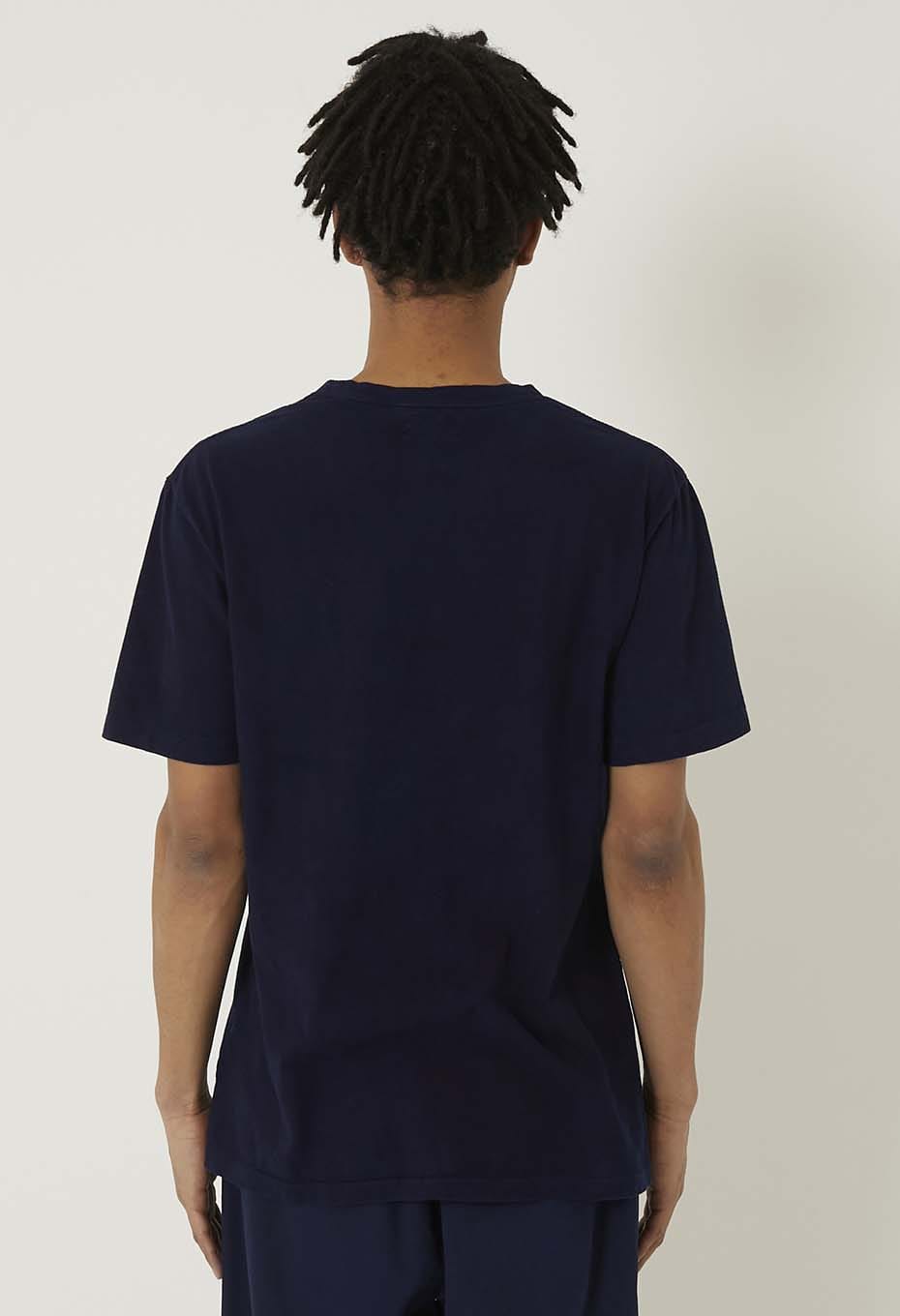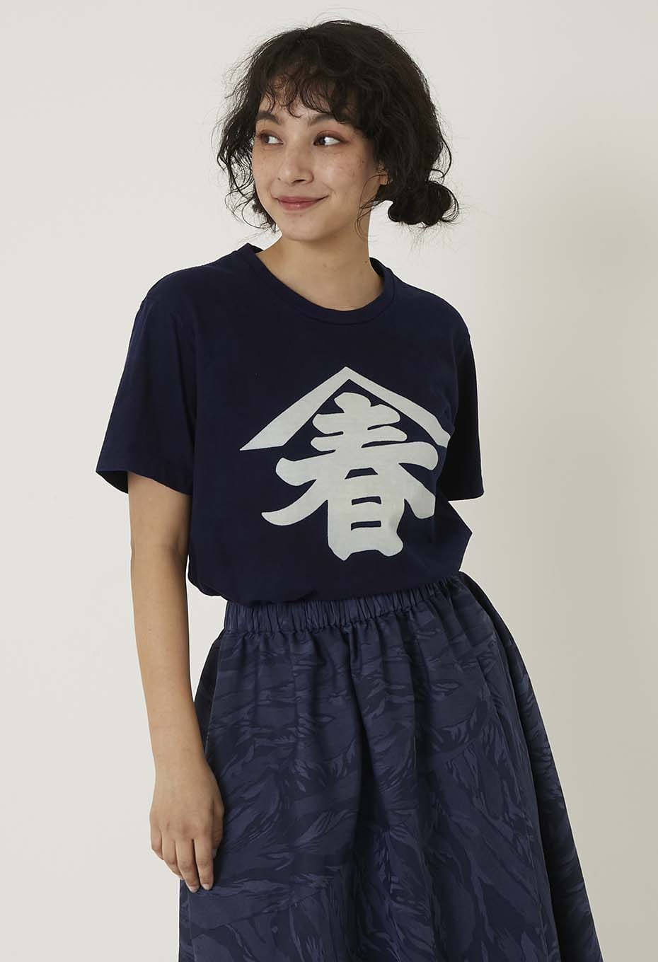 - 大きな山を表すモチーフと「春」をインディゴ染のTシャツに抜染で表現しています。盛り上がるなどの意味を持つ山は屋号として古くから親しみ使われています。