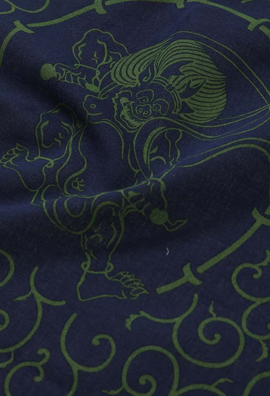 - 日本を代表する屏風画で有名な「風神雷神」をモチーフにして、唐草文様でまとめました。和柄でありながらもポップな色合いが目を引くデザインです。