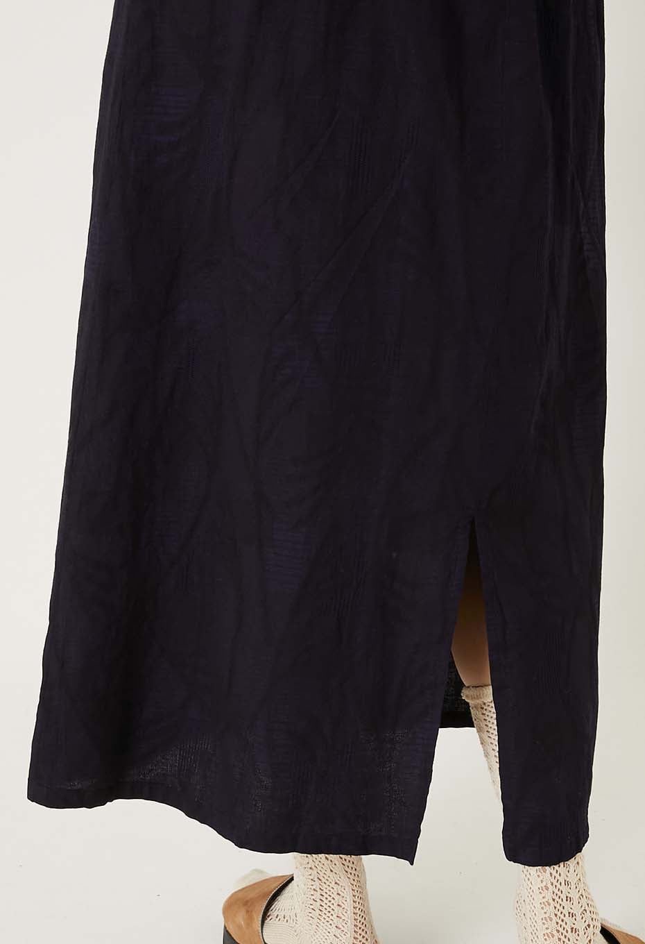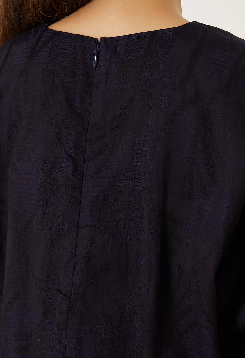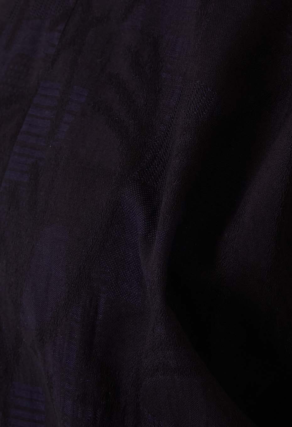 - タテ糸に100番双糸、ヨコ糸に40番単糸と異なる太さのインディゴコットン糸で織り上げたジャカード織物です。太い糸はより早く色落ちするため、洗うごとに柄が浮かび上がるような変化を遂げます。パッチワークのような背景に細かい粒子で描かれたススキ柄を様々な織組織で表現しました。アンティークのドレスをイメージしたドルマンスリーブのワンピース。ウエスト位置をを高く見せてくれるウェーブラインの切替が腰にのり、ウエスト回りがすっきりとみえます。たっぷりとしたドルマンスリーブに袖口は長い剣ボロを配し、ギャザーを寄せています。肩回りはふんわりし、袖口はきゅっと細くメリハリのあるシルエットが特徴。袖口についた少し厚みのある貝ボタンもさりげないポイントです。