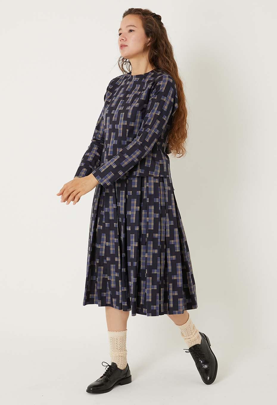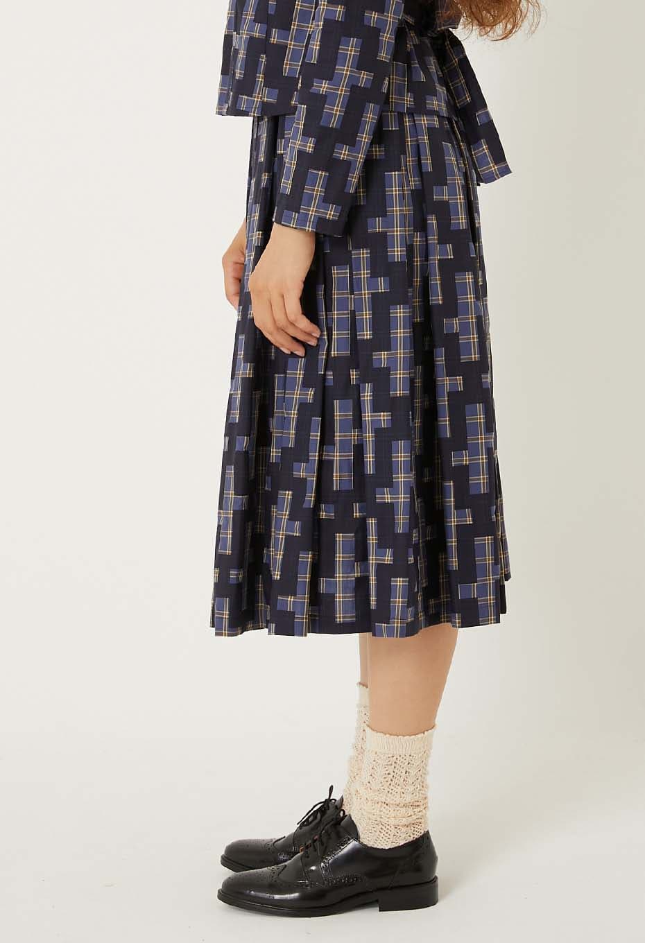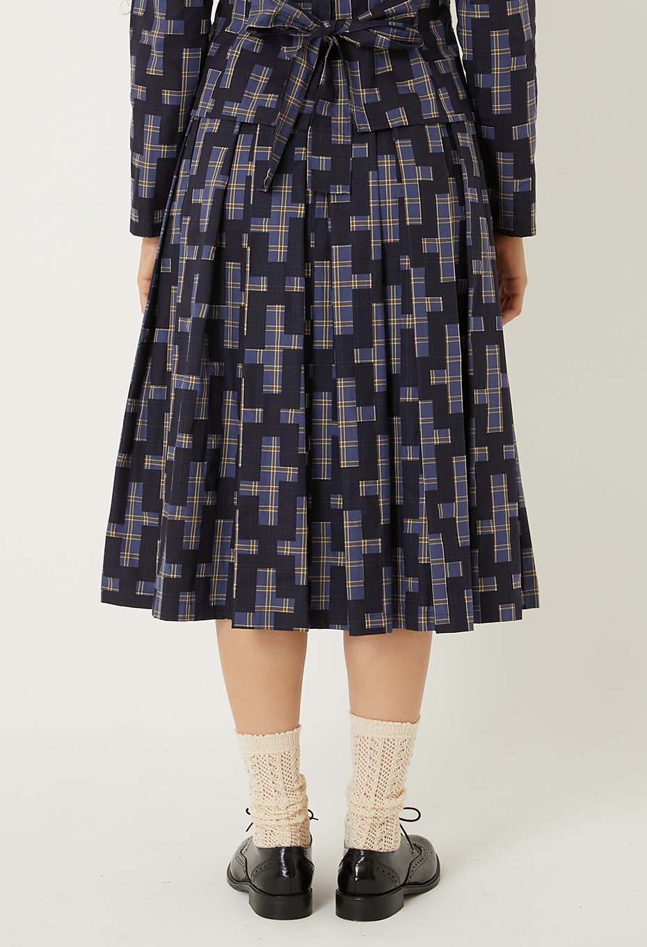 - オーガニックコットンを100%使用した薄手でふくらみのある先染めチェックのベース生地に、それぞれインディゴ顔料と焦げ茶の顔料で伝統的な刺し子の柄である流し十字を抜いた柄をのせ、ハリ感をを持たせました。小さいマスでできたレトロなチェック柄の上にチェーンのように連なる大きな柄が大胆で迫力があります。ウエスト周りに大きい分量でとったボックスプリーツを配し、ふわっと裾が広がるスカート。見た目のボリュームに反して、とても軽い着心地で季節を問わず着用いただけます。