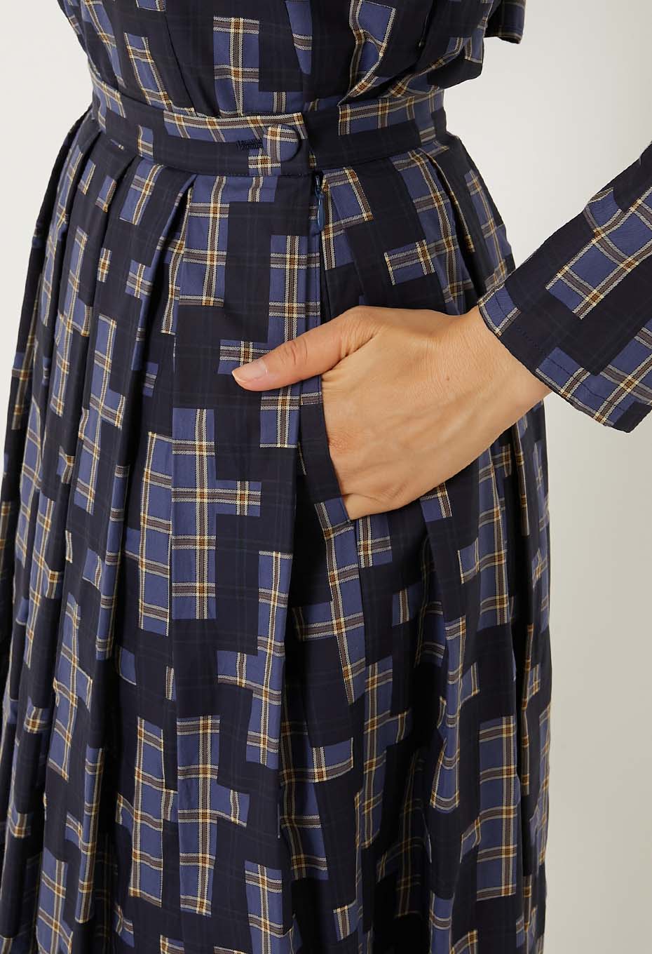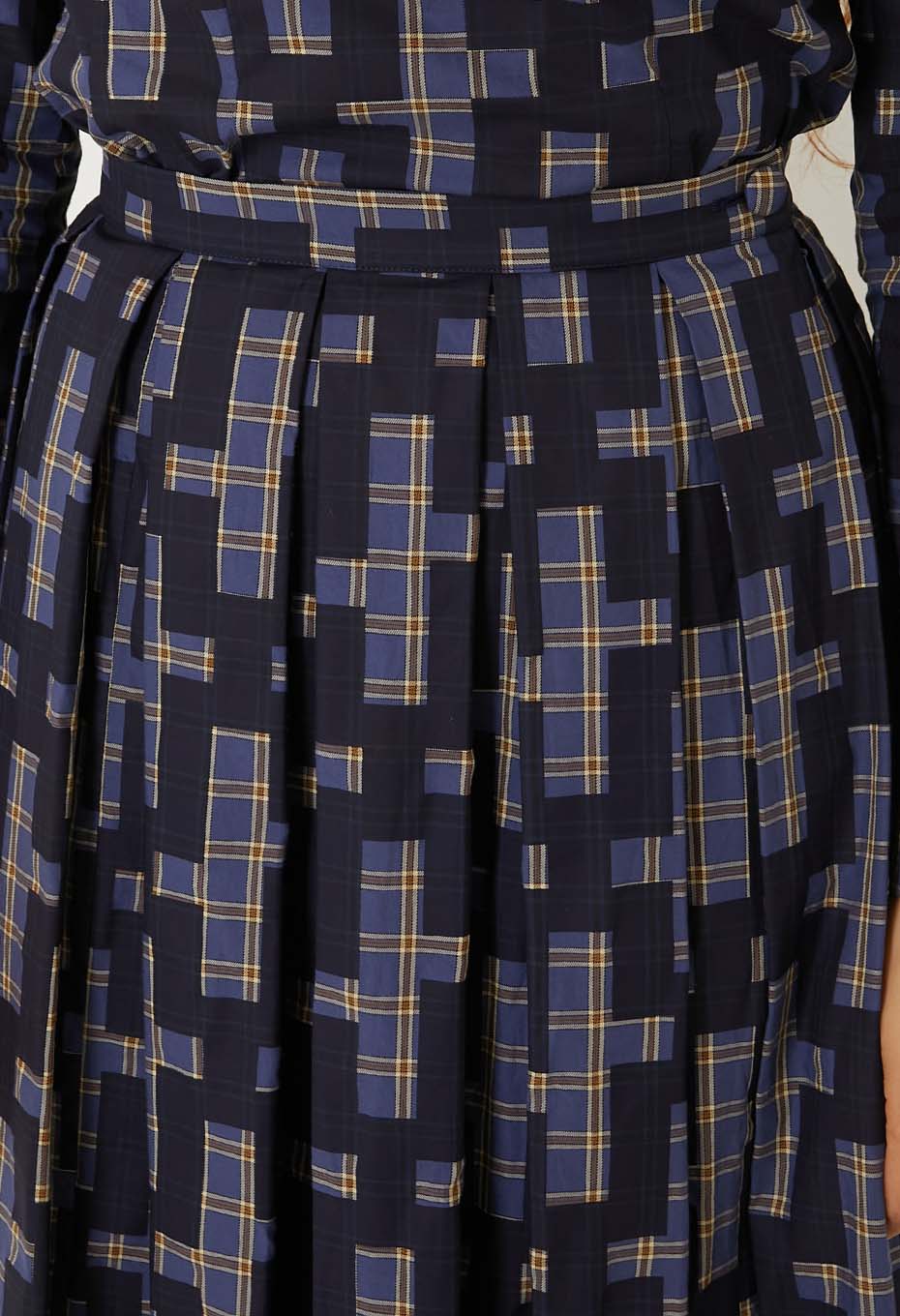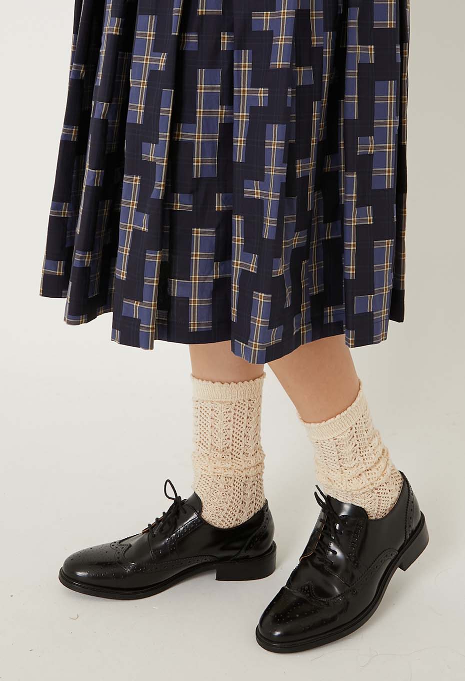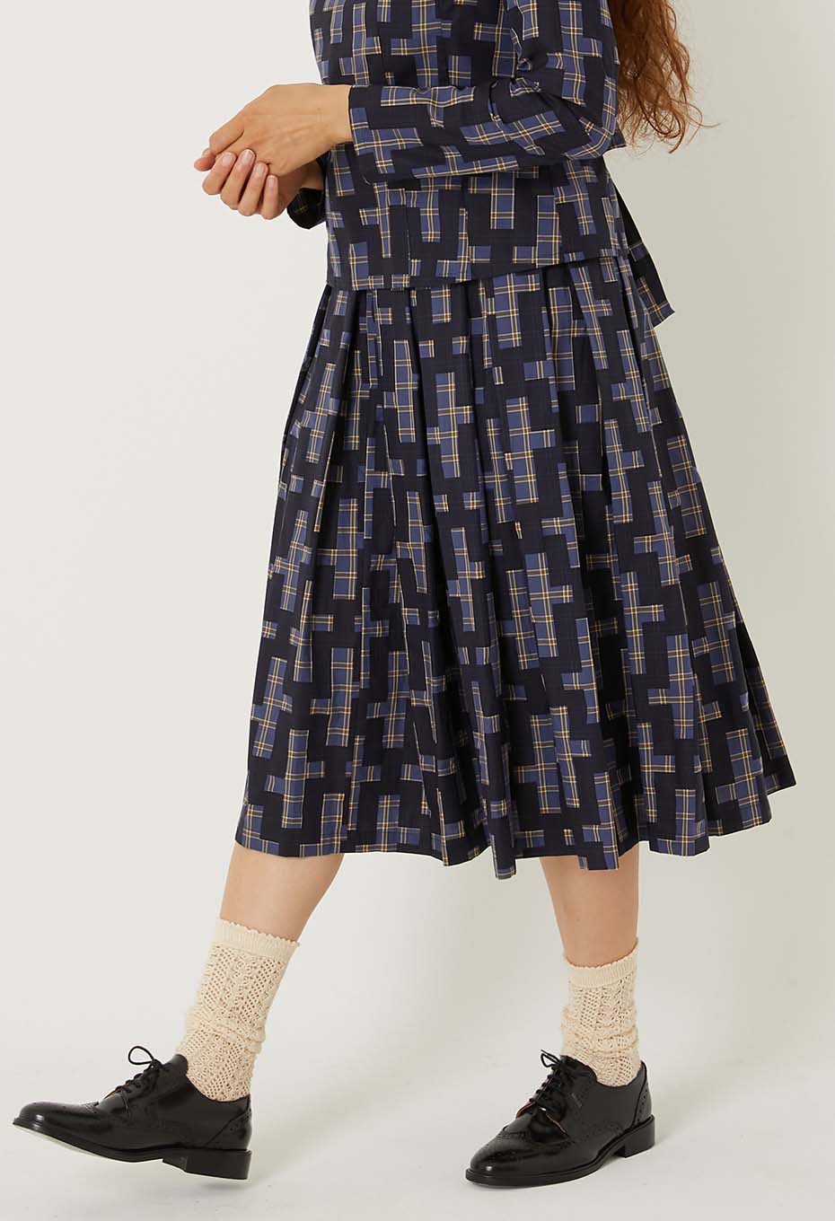 - オーガニックコットンを100%使用した薄手でふくらみのある先染めチェックのベース生地に、それぞれインディゴ顔料と焦げ茶の顔料で伝統的な刺し子の柄である流し十字を抜いた柄をのせ、ハリ感をを持たせました。小さいマスでできたレトロなチェック柄の上にチェーンのように連なる大きな柄が大胆で迫力があります。ウエスト周りに大きい分量でとったボックスプリーツを配し、ふわっと裾が広がるスカート。見た目のボリュームに反して、とても軽い着心地で季節を問わず着用いただけます。