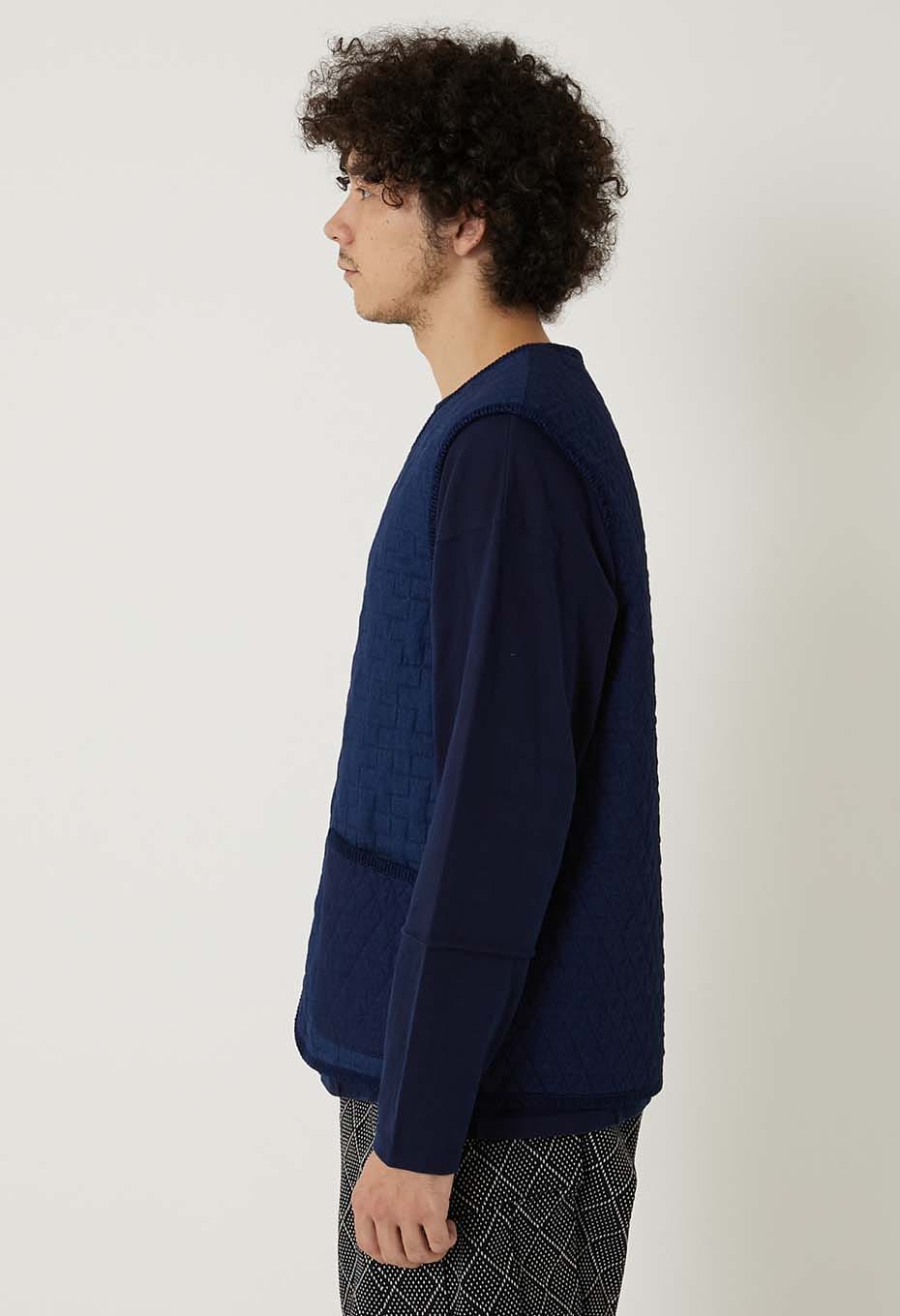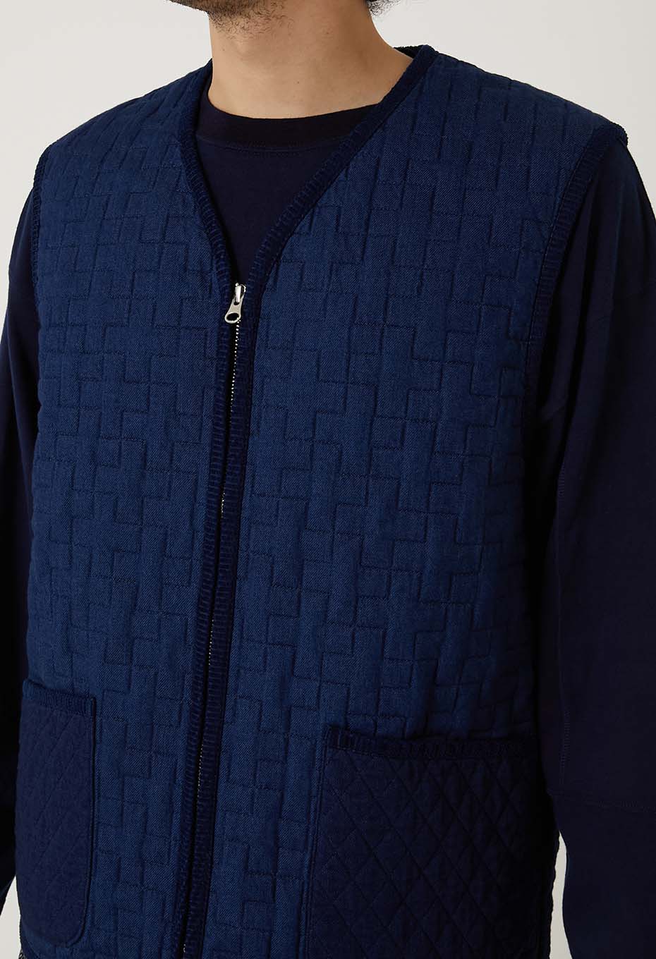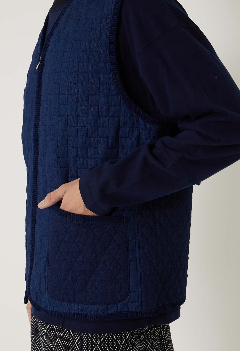 - インディゴの先染めコットン糸で織り上げたツイル素材をベースに濃色はベーシックなダイヤ柄、淡色には伝統的な刺し子の柄である十字柄のステッチを施しキルティング加工をしました。旧式のシャトル織機でゆっくりと織ることで得られる柔らかな風合いが特徴の素材が洗いをかけることによってさらに起毛感とキルティングの立体感が生まれます。パーツづかいで異なる柄のキルティングを切り替えてポイントにしています。身頃もパイピングも全てインディゴの素材を使用し、経年変化を楽しんでいただけます。フロントジップですっきりしたシルエットは、ジャケットのインナーにも秋の立ち上がりの軽いアウターとしても重宝するベストです。