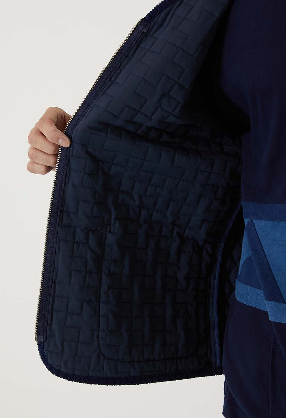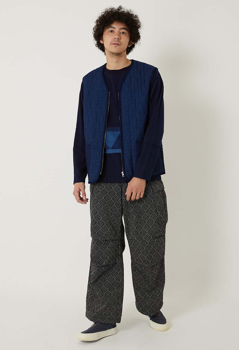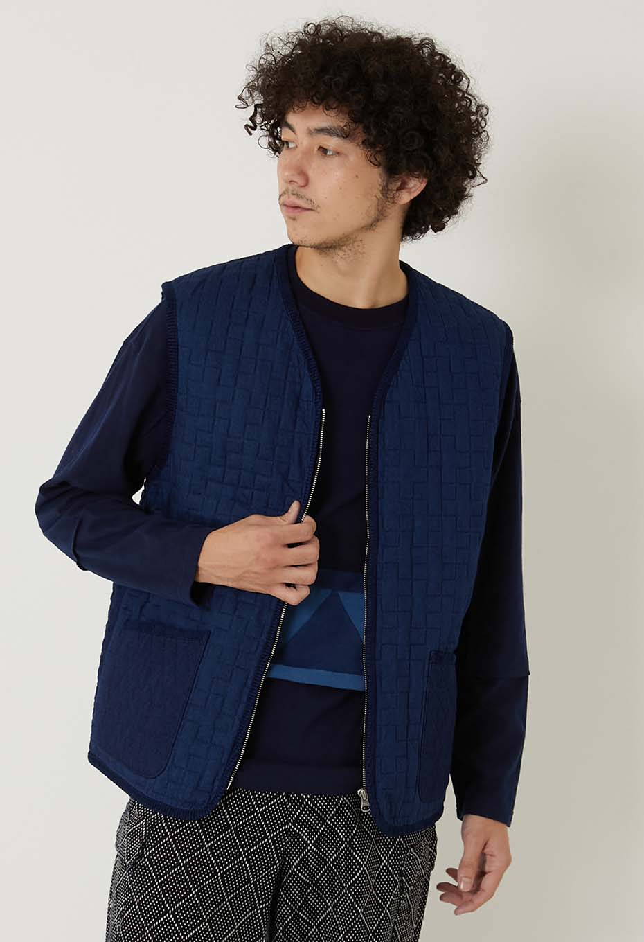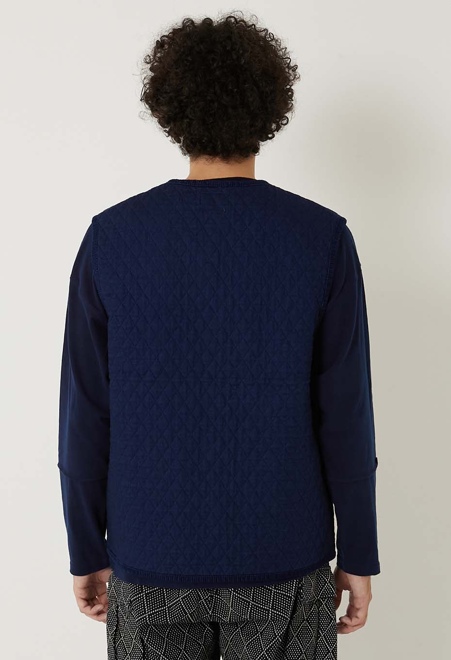 - インディゴの先染めコットン糸で織り上げたツイル素材をベースに濃色はベーシックなダイヤ柄、淡色には伝統的な刺し子の柄である十字柄のステッチを施しキルティング加工をしました。旧式のシャトル織機でゆっくりと織ることで得られる柔らかな風合いが特徴の素材が洗いをかけることによってさらに起毛感とキルティングの立体感が生まれます。パーツづかいで異なる柄のキルティングを切り替えてポイントにしています。身頃もパイピングも全てインディゴの素材を使用し、経年変化を楽しんでいただけます。フロントジップですっきりしたシルエットは、ジャケットのインナーにも秋の立ち上がりの軽いアウターとしても重宝するベストです。