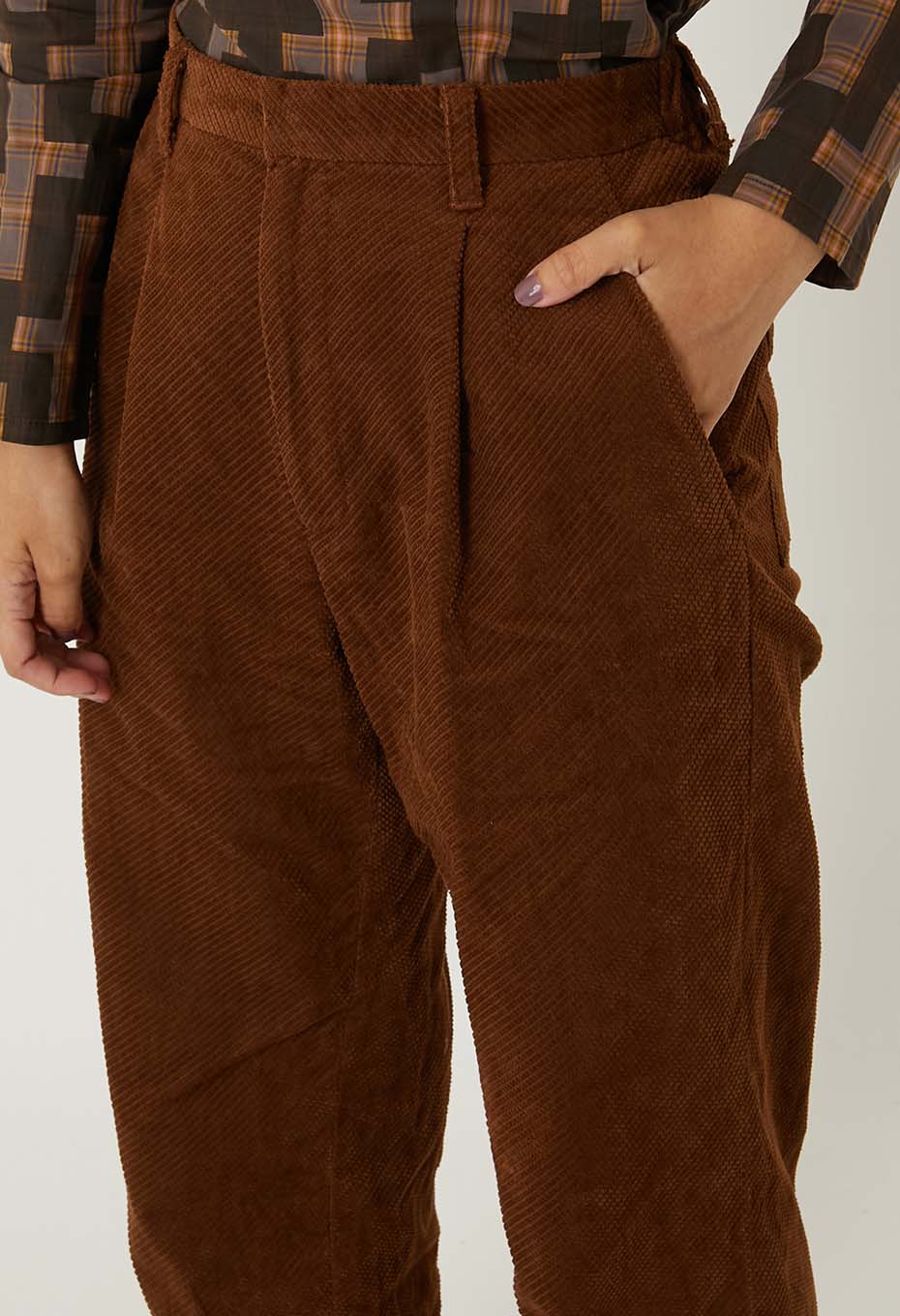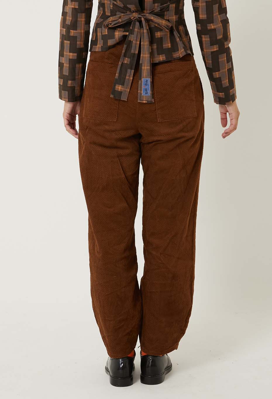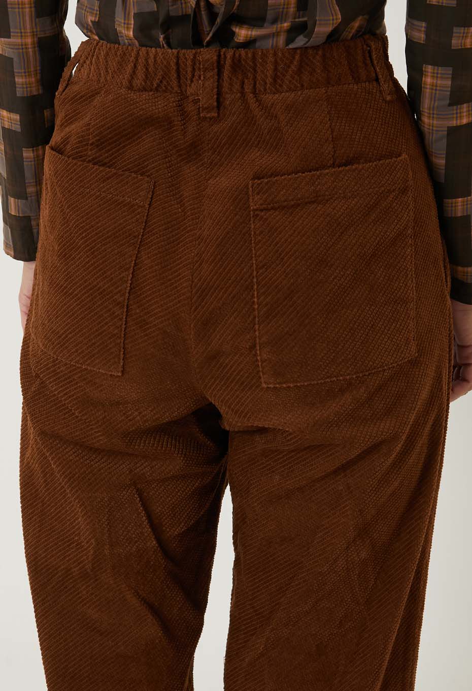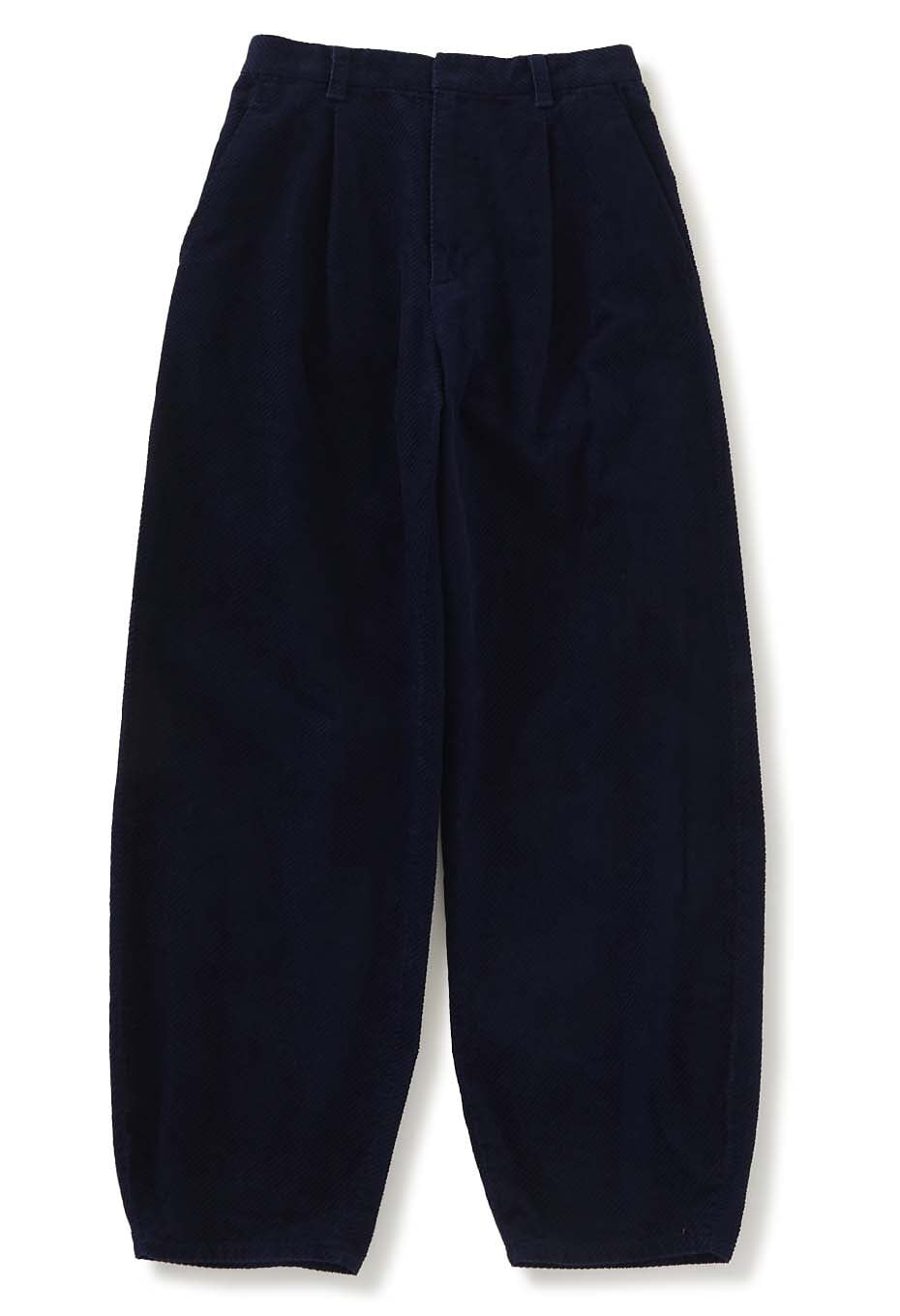 - ドビー織機で綾目に織られたコーデュロイ。織の特性上ややストレッチ性があるため動きやすく着心地の良い素材です。毛足は短く畝は細めですがカジュアル過ぎず、きれいな表面感や一見コーデュロイには見えない意外性のある生地感が特徴です。それぞれ生地染めされた深みのあるブラウンとインディゴの2色展開です。裾が丸くテーパードした特徴的なシルエットのパンツ。ワイド過ぎずすっきりした太さで、ストレートに伸び裾回りで急カーブしています。ワークパンツのようですが、素材の美しさやメリハリのあるシルエットできれいな印象もあり、洗練された雰囲気を持っています。