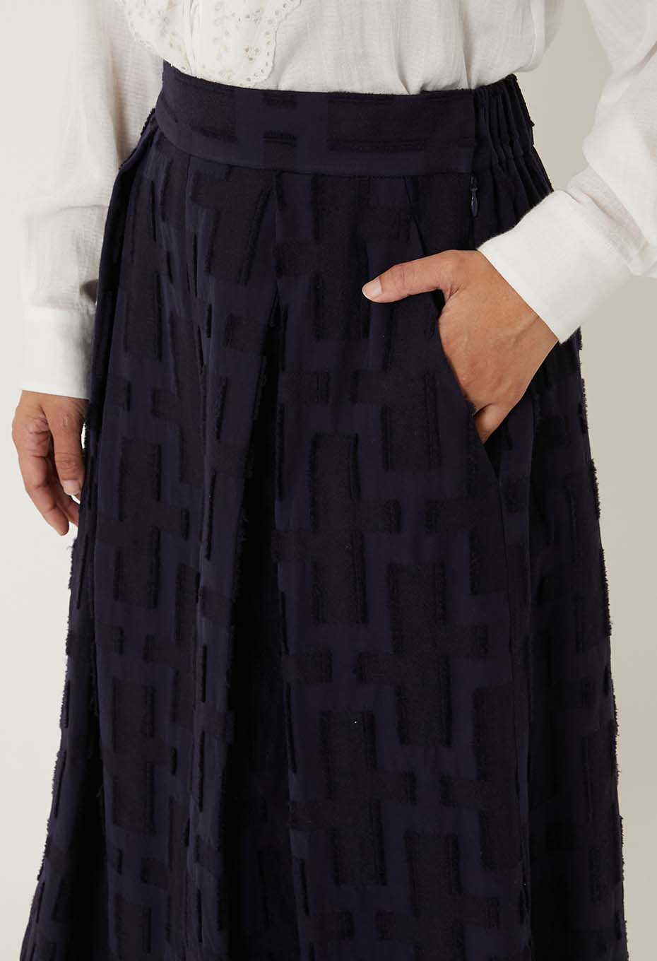 - ベースはコットン、柄部分はコットンウールになるようにジャカード織機で織り上げ、柄の周りでウール糸をカットしています。カットしたウール糸が生地を湯通しする際に絡み合いふさふさした毛が柄を縁どります。十字柄の縦のエッジが縁どられ立体感のある面白い生地感が特徴です。ベースがコットン素材なのでロングシーズン着用できます。