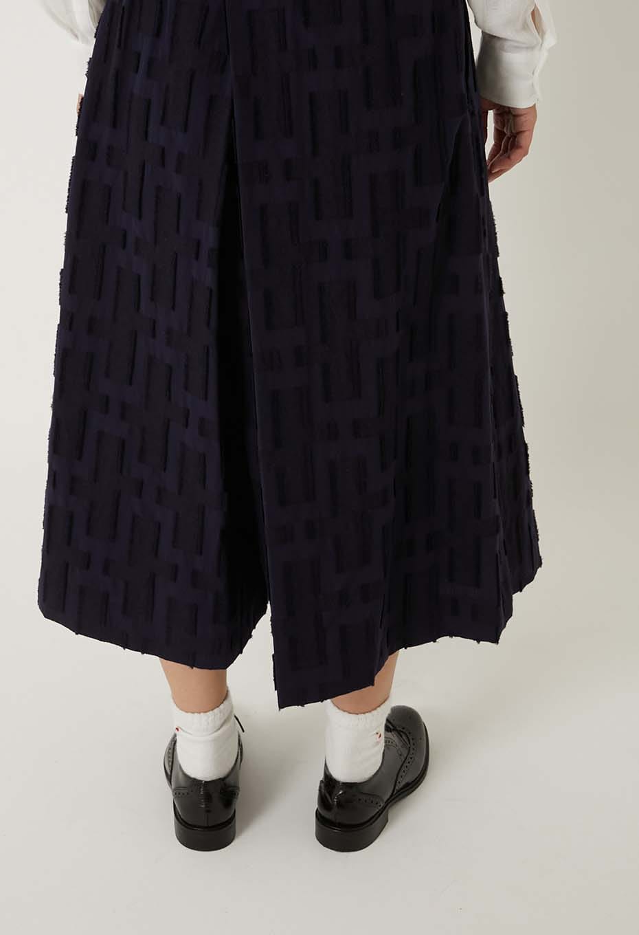 オリジナルのハカマパンツをもとにタックのデザインやレングスを変更しキュロットパンツにアップデートしました。前にはタックが2本重なるように入り、ベルト巾を広くしウエスト周りにポイントがくるようにしています。生地にハリ感があるため、ふんわりとしたシルエットをキープしてくれます。丈が短いことで重たい印象にならず、普段使いしやすくなりました。