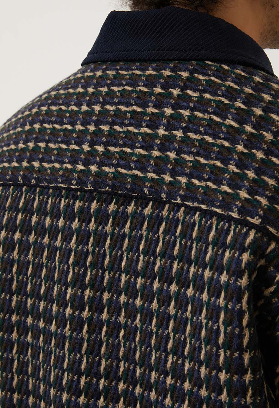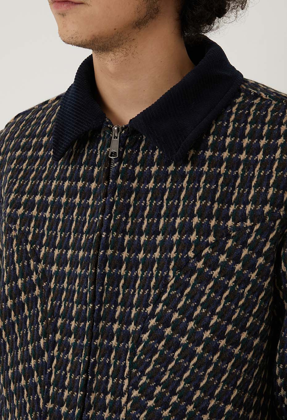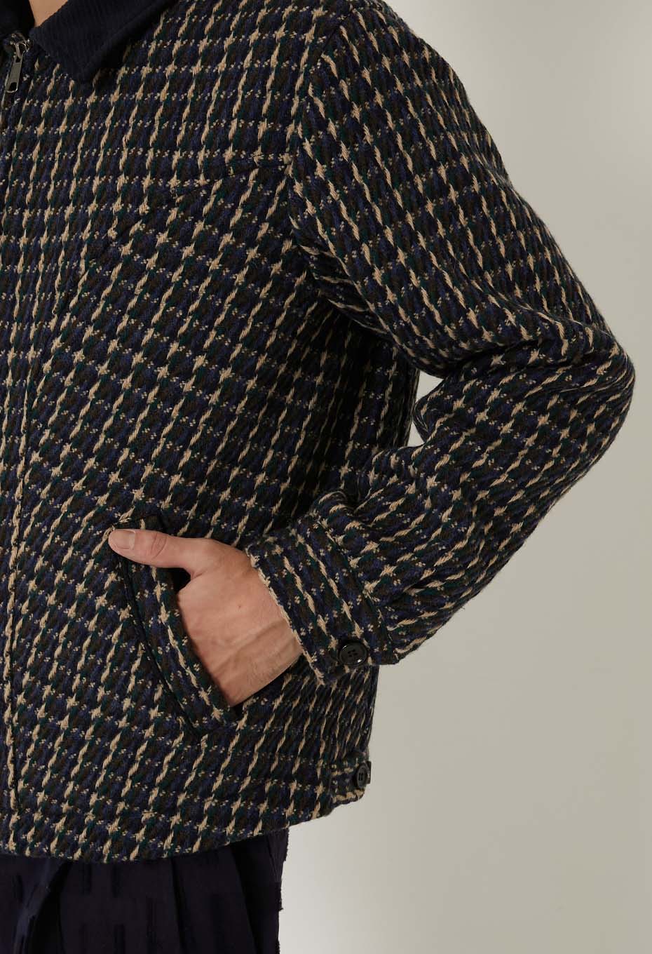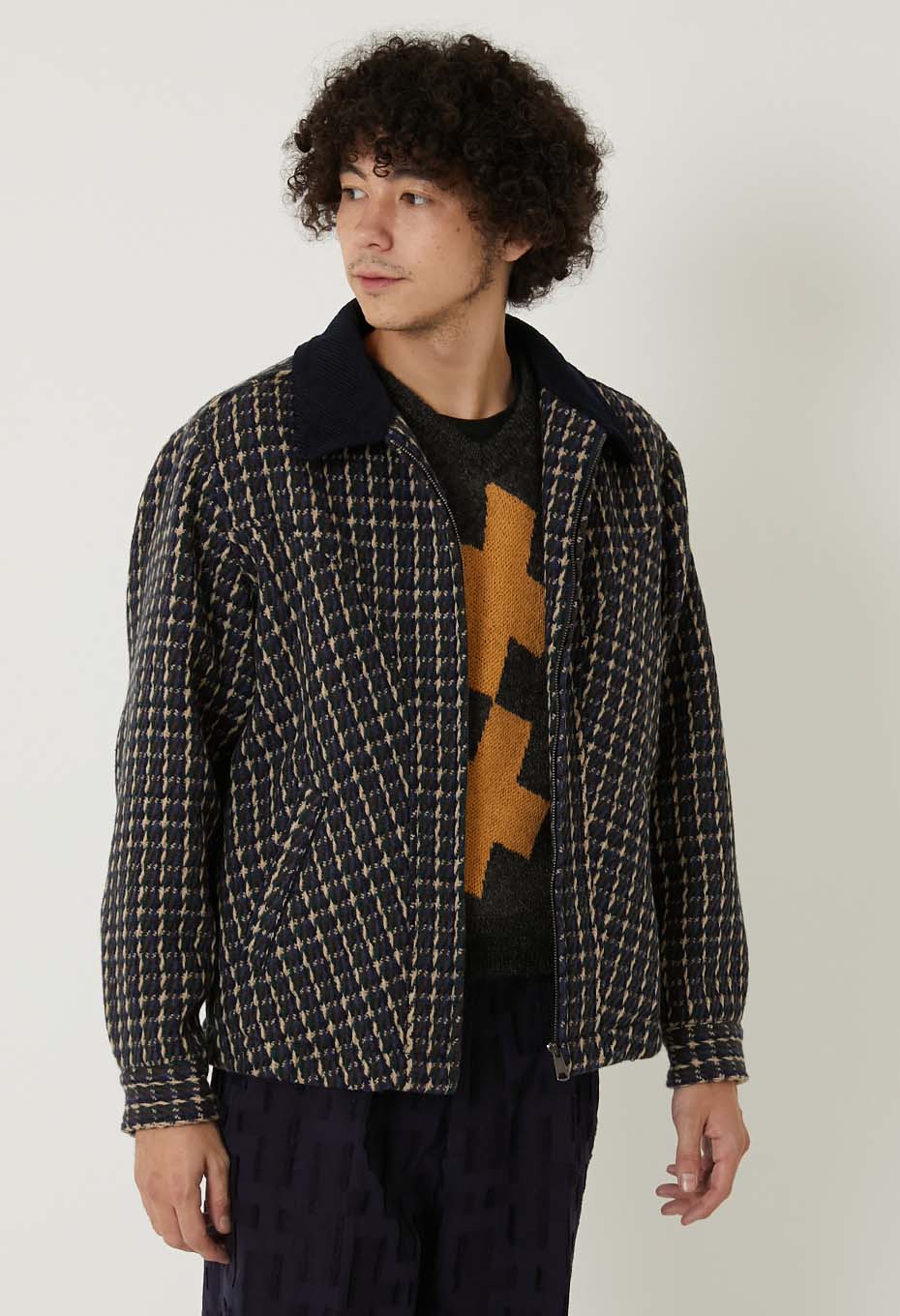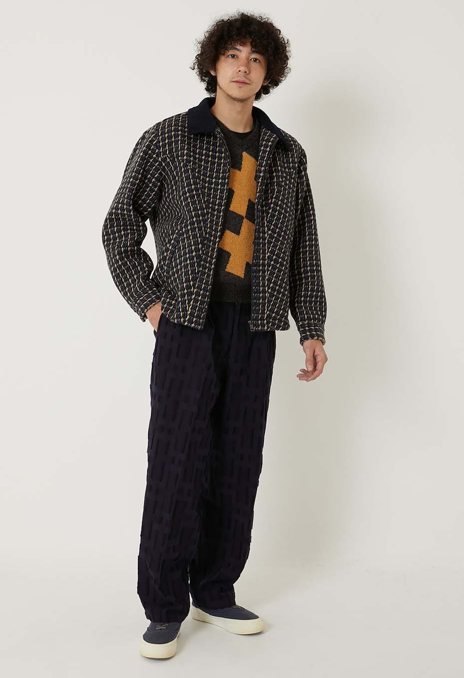 - 紡績、裁断・縫製、製品回収と洋服が作られる様々な工程から出る繊維廃棄物や膨大な製品廃棄物からリサイクルで作られた糸を使用しています。リサイクルウールは資材もその時々で異なるため、全く同じ色味には仕上がらないのが特徴。今季は濃紺、茶色、緑、青、生成の5色の糸でカルゼ織のチェック柄にし、立体感のある織地に仕上げました。前身頃の切り替えを利用してバイアスに生地を配置しポイントにしています。フロントはジッパー使いで表襟とポケット口、背中ヨークにあしらったコーデュロイに濃紺を効かせたショートジャケットです。ボトムを選ばず、合わせやすいシルエットです。