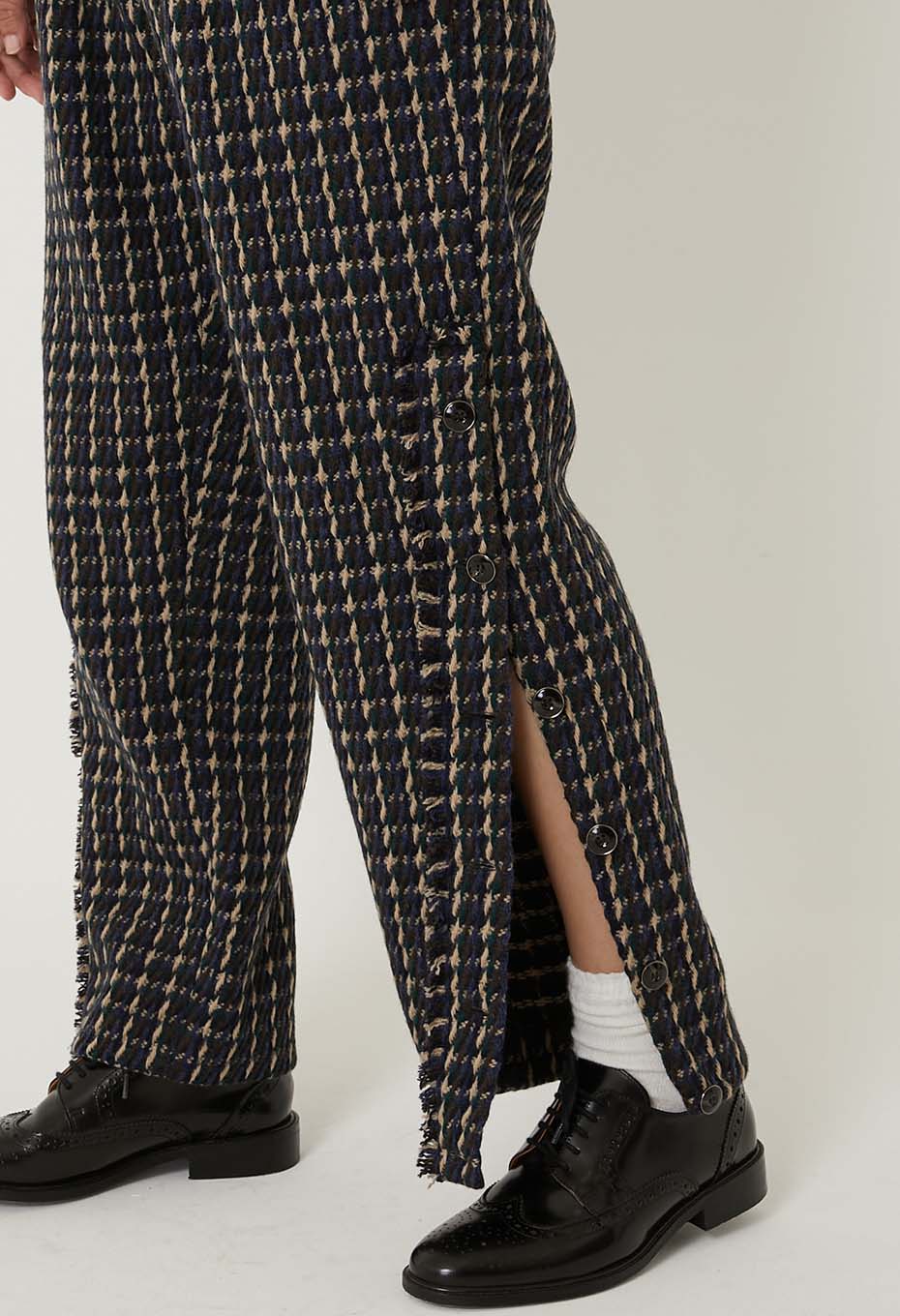 裾にボタンをあしらい閉じていればテーパード、開ければフレアのように見え、シルエットに変化をつけられるパンツです。ヒップ回りはタックを入れゆとりがあり、裾に向かって細くテーパードしています。裾周りの短冊は断ち切り仕様でフリンジがポイントになっています。ボタンもリサイクルされた資材で生産されているものを選びました。