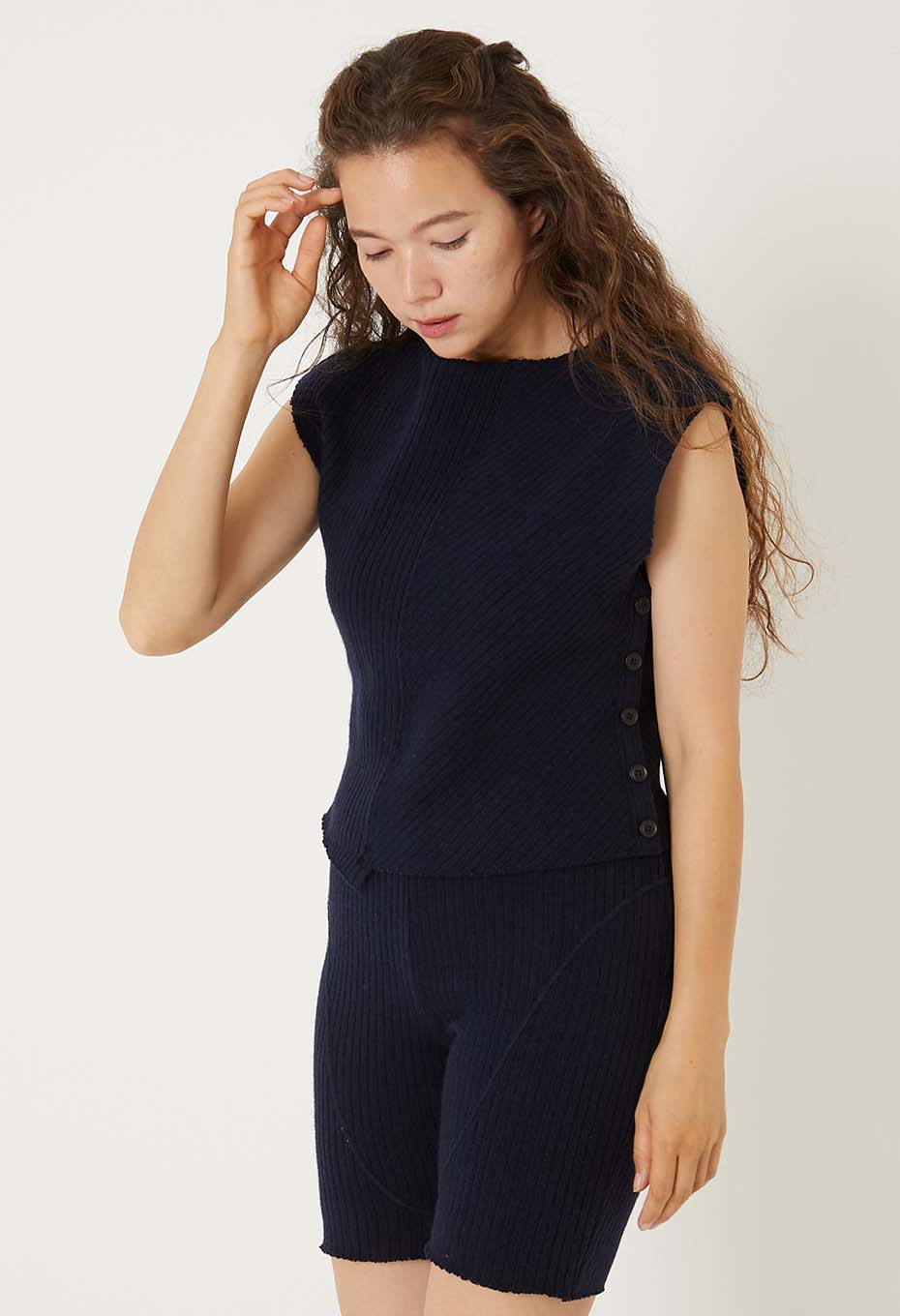 - 紡績、裁断、縫製と洋服が作られる様々な工程から出る繊維廃棄物や製品回収物からリサイクルで作られた糸を使用して、針抜きのテレコ編みで素朴な風合いの表面に仕上げました。裏側は肌当たりの良い細番手のコットン糸で天竺編みを接結して着心地の良さもポイントです。脇がボタン開きになっているコンパクトなノースリーブトップス。肩やネックはゆったりとし、ウエストで緩やかにシェイプされています。袖巾の広いトップスでもボタンの開きで調節すればシルエットに影響することなく着用でき、脇を全開にしたり、ボタンをずらしてシルエットを変えてみたりと何通りも楽しめます。グレーとベージュの二色使いで編まれ、混じり気のある色合いのブラウンと深い濃紺に裏面に茶色が配されたネイビーの二色展開です。