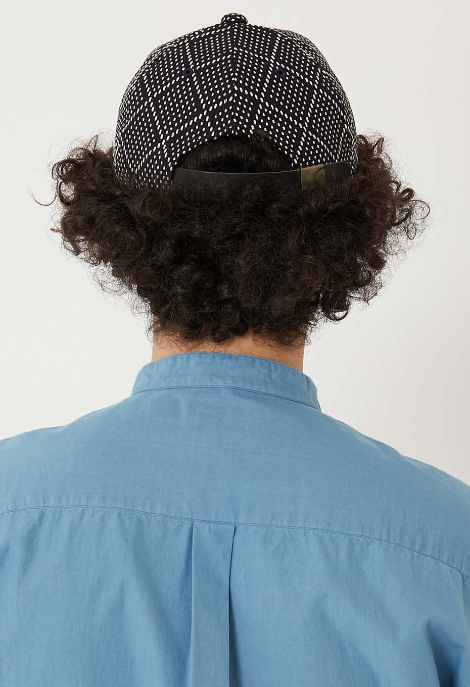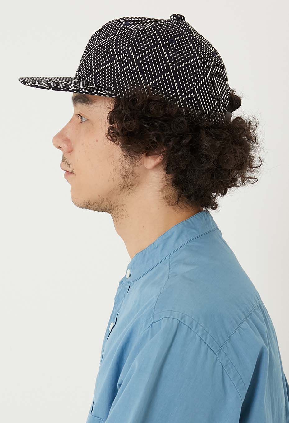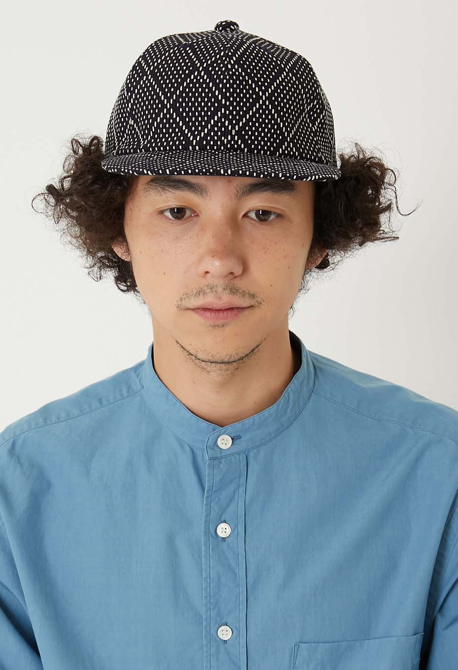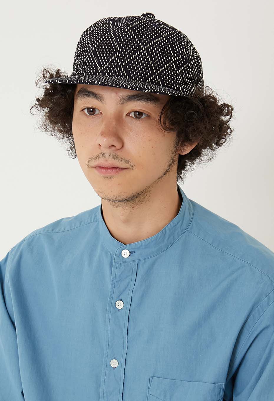 - 軽い素材感が魅力のステッチサシコシリーズ。今季はインディゴ糸と生成りの糸を使用しドビー織機でダイヤのような模様に織り上げました。正面のクラウンと呼ばれるパーツを少し高めに設計したベースボールキャップ。後ろのアジャスターはレザー使いにしてクラシックな雰囲気に仕上げました。定番的に展開しており長く愛されている形です。