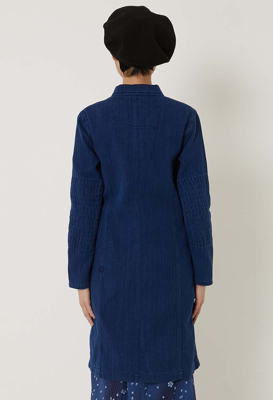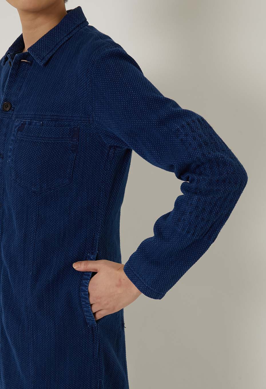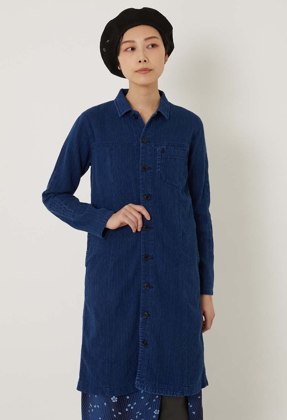 - 「カセゾメ」と呼ばれる手法でインディゴに染め上げた糸を使い、シャツ地のような軽い着心地を求めてオリジナルで作った刺し子生地を使用したワンピース。