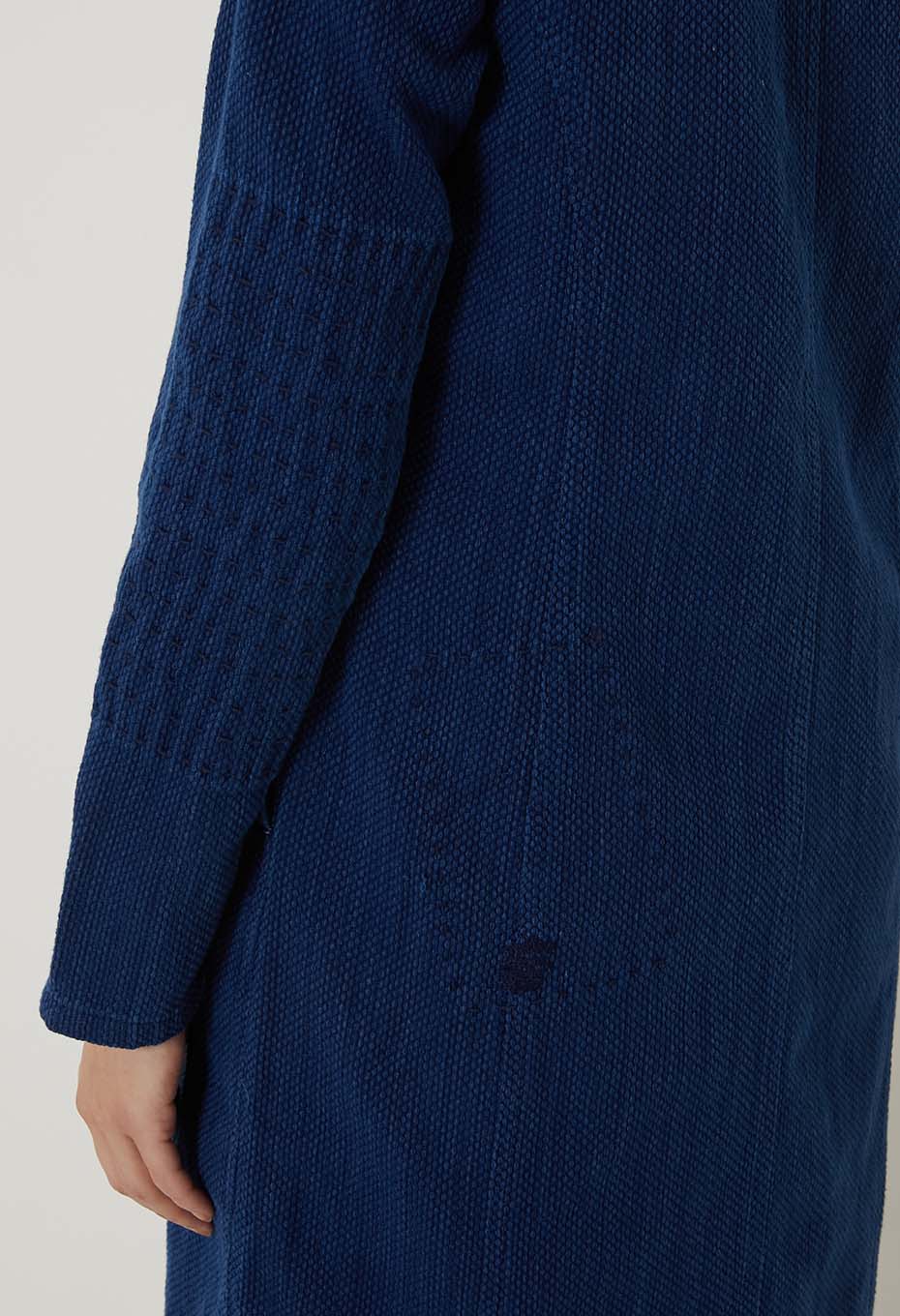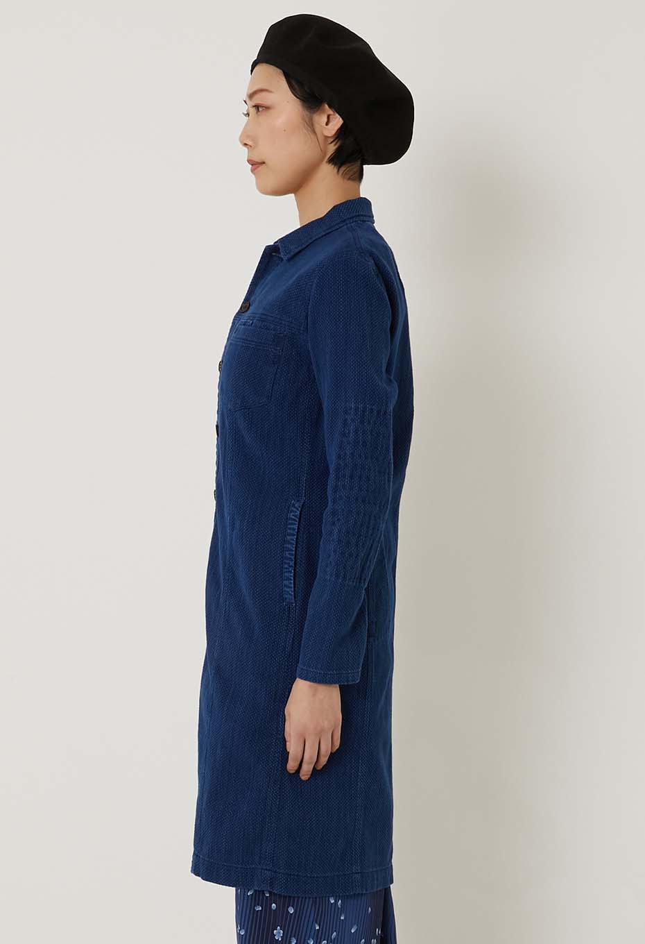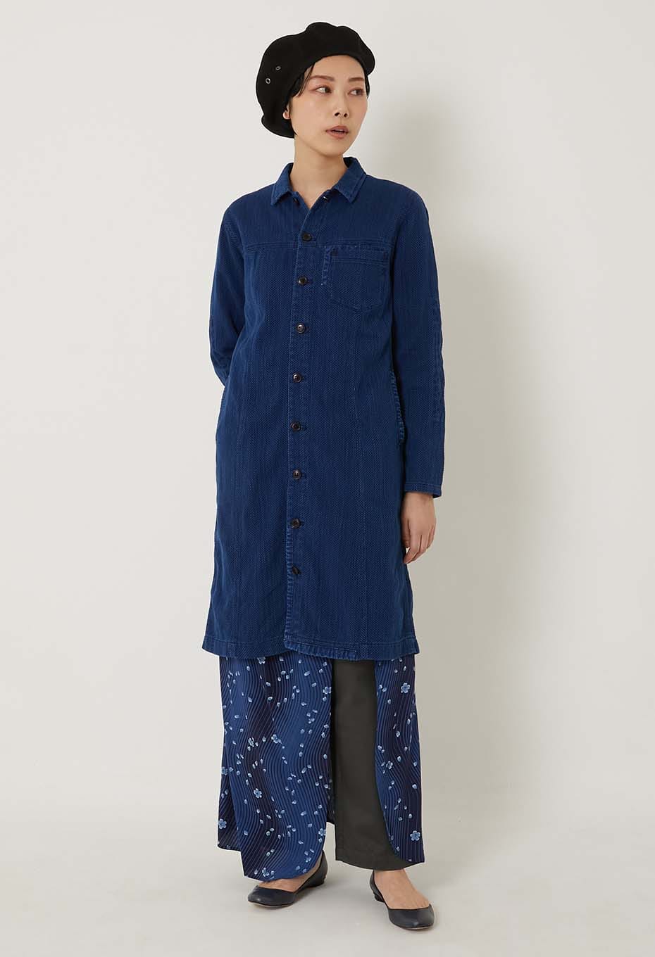 - 「カセゾメ」と呼ばれる手法でインディゴに染め上げた糸を使い、シャツ地のような軽い着心地を求めてオリジナルで作った刺し子生地を使用したワンピース。