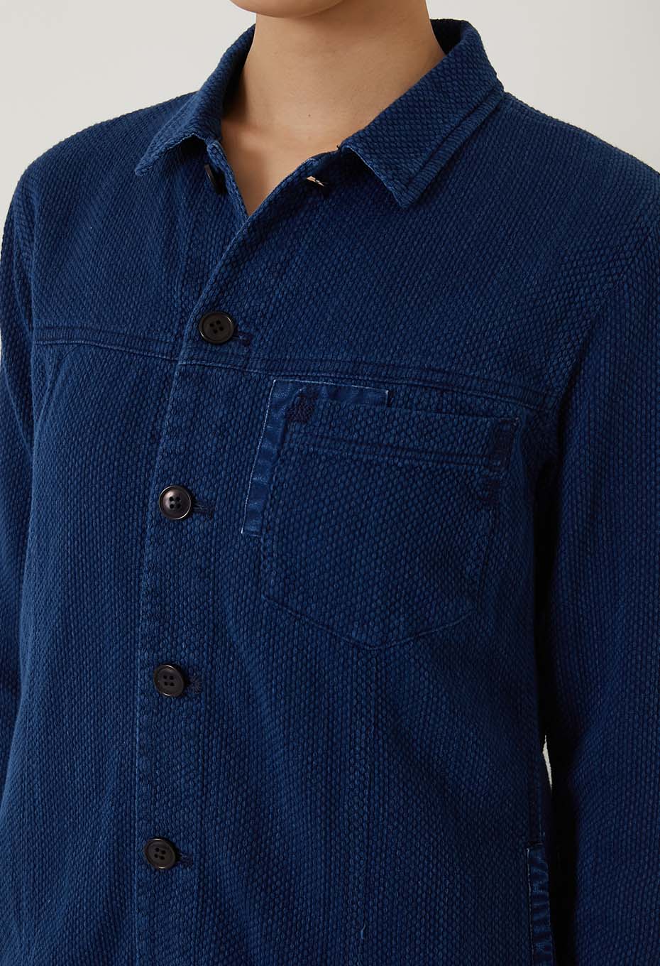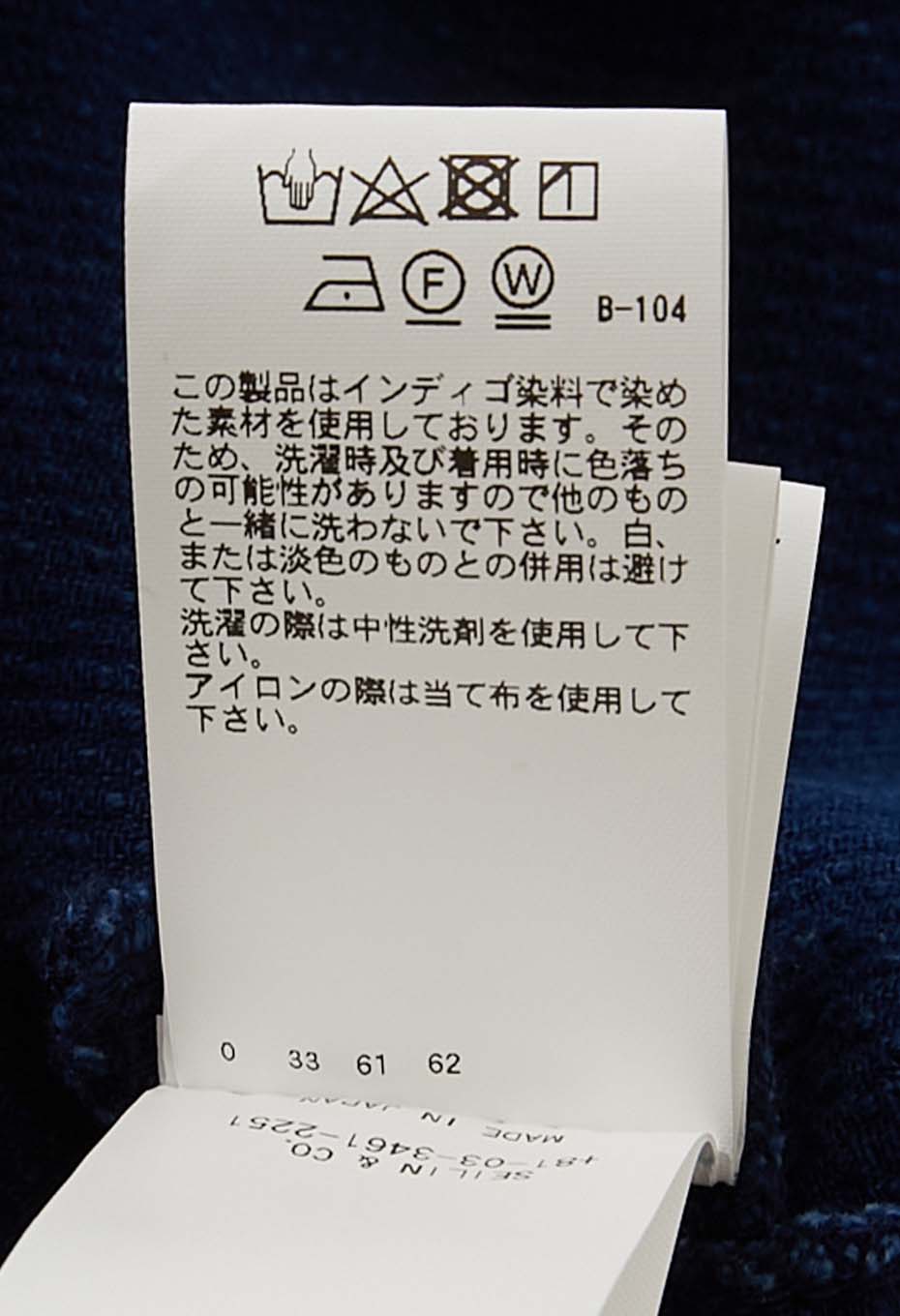 製品加工で色を落としてあたりを付けて風合いを出しています。ざくざくと手かがりされたボタンホールなど細かなディテールの発見が楽しいアイテム。木の実でできたボタンを本藍染にしたものを使用し、ボタンまで一緒に経年変化を楽しんでいただけます。