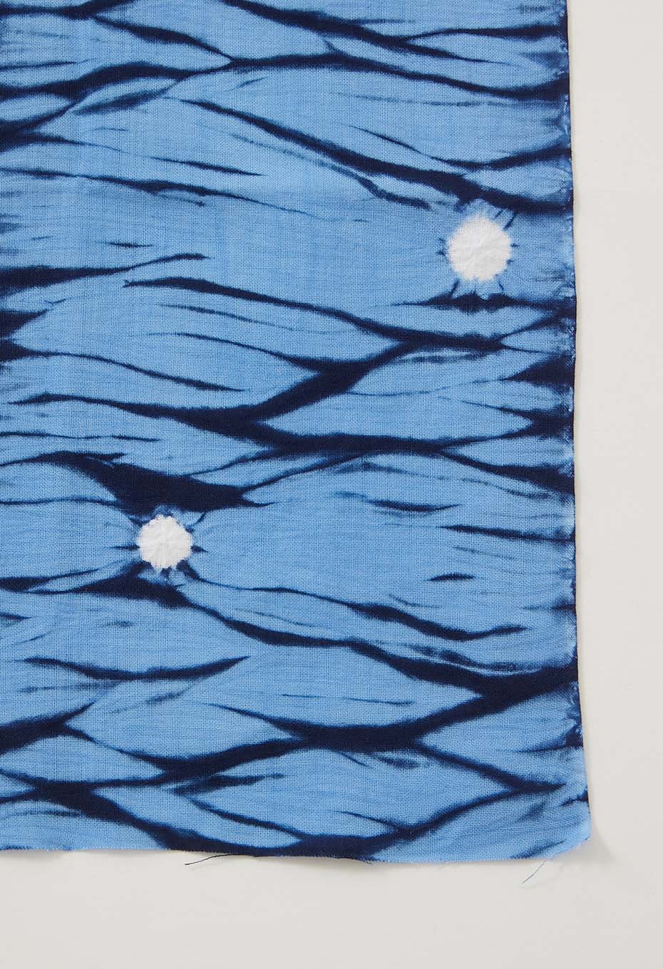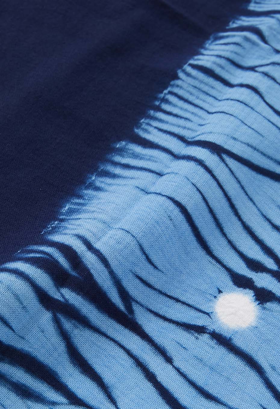 職人が一つ一つ手作業で絞り加工を施し、2回の染め工程を踏んで完成する、手の込んだアイテムです。テキスタイルとしてインテリアにも使える一品です。
