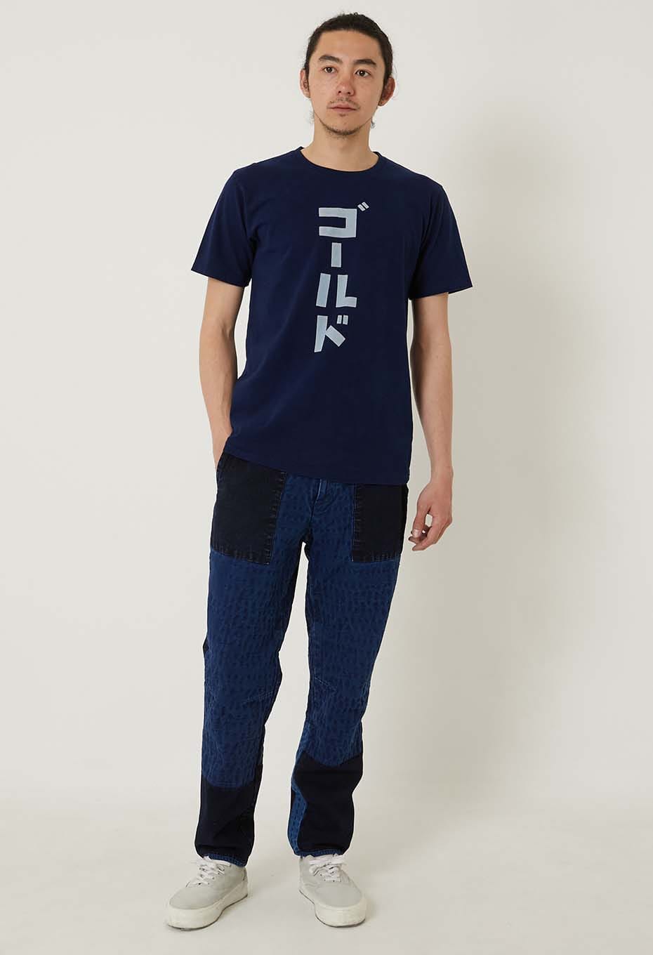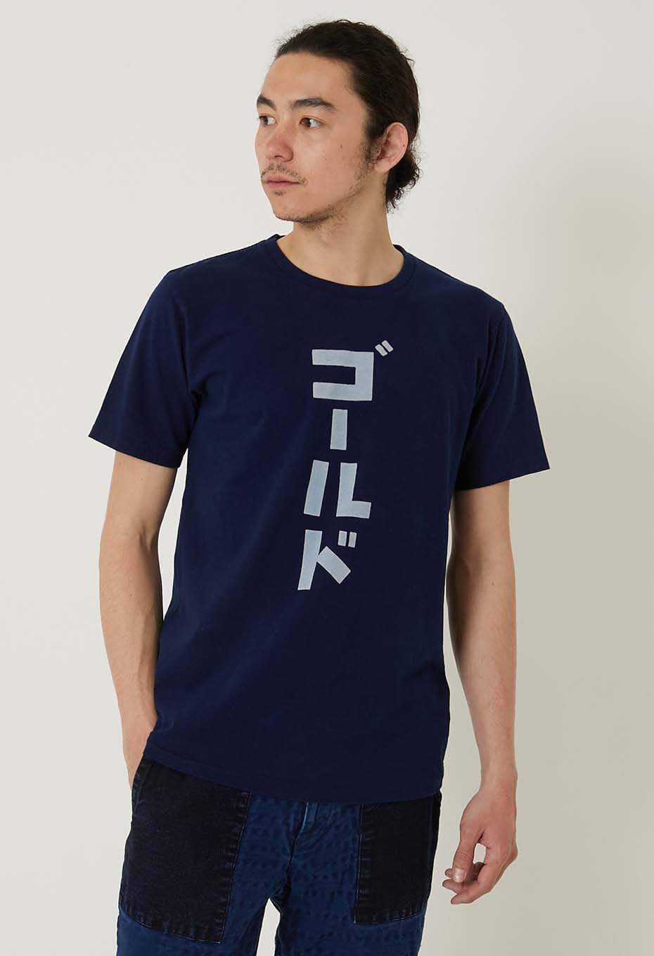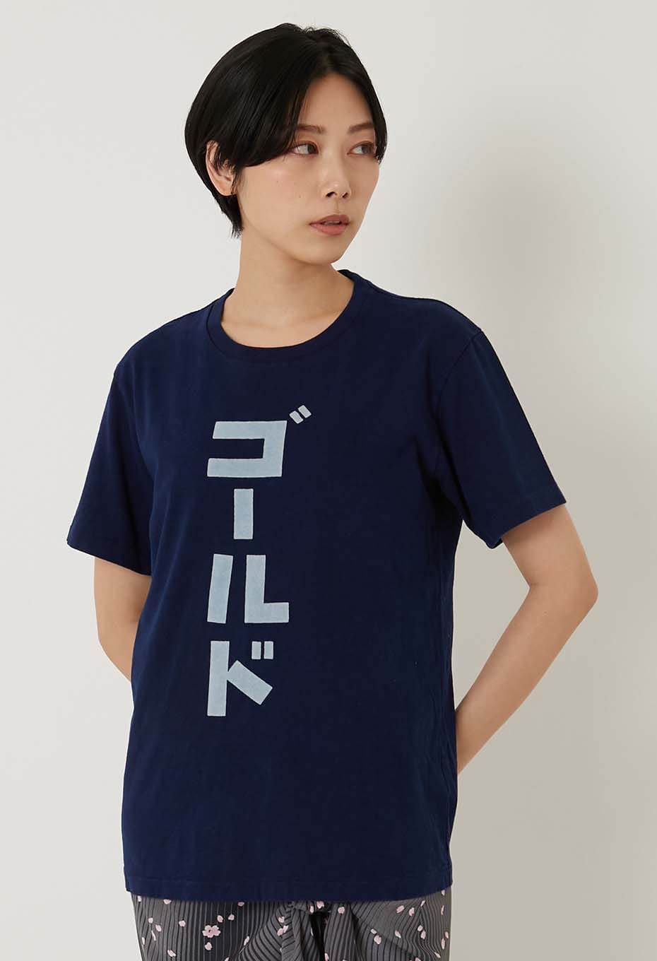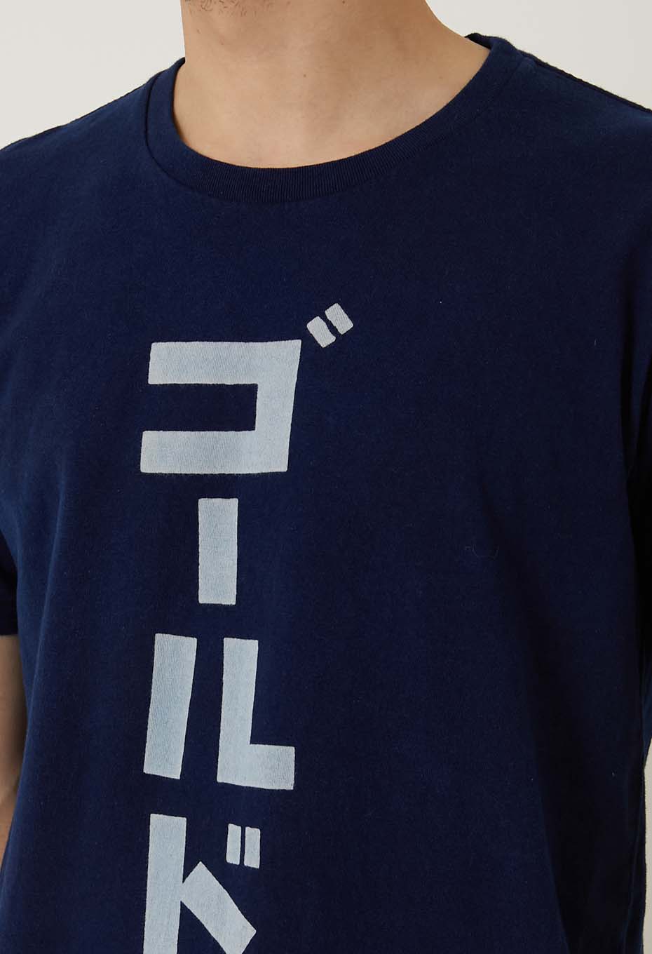 - インパクトのあるカタカナ文字を使ったインディゴ抜染Tシャツです。どこか懐かしさも感じる書体の直線がユニークです。