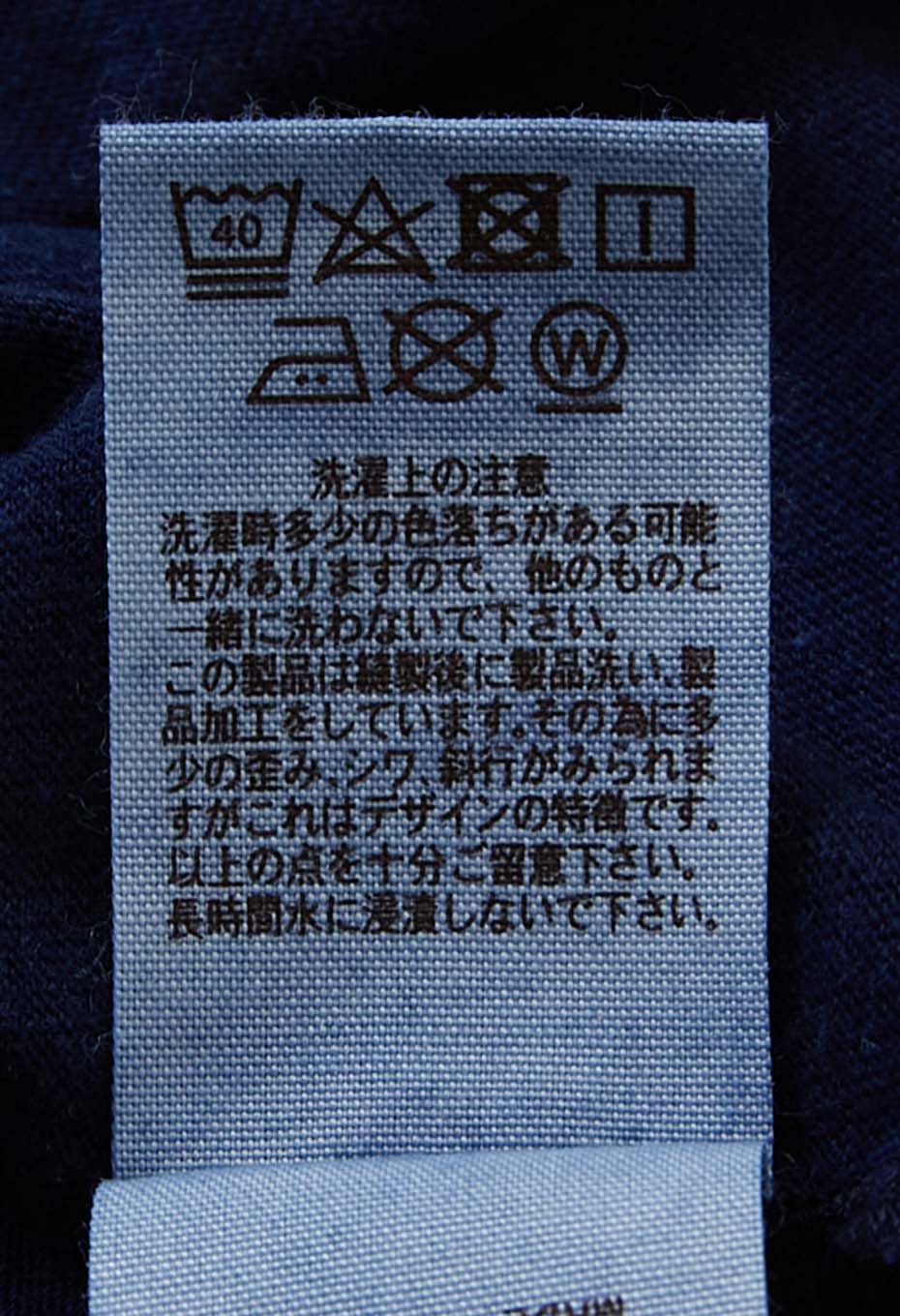 この製品は、インディゴ染料で染めた素材を使用しておりますので、繰り返し着たり、何度も洗濯することにより、濃いブルーから淡いブルーに移り変わっていきます。白又は淡色のものと組み合わせて着たり、重ね着をすると色が移りますので避けてください。洗濯の際は色が落ちますので単独洗いでお願いします。