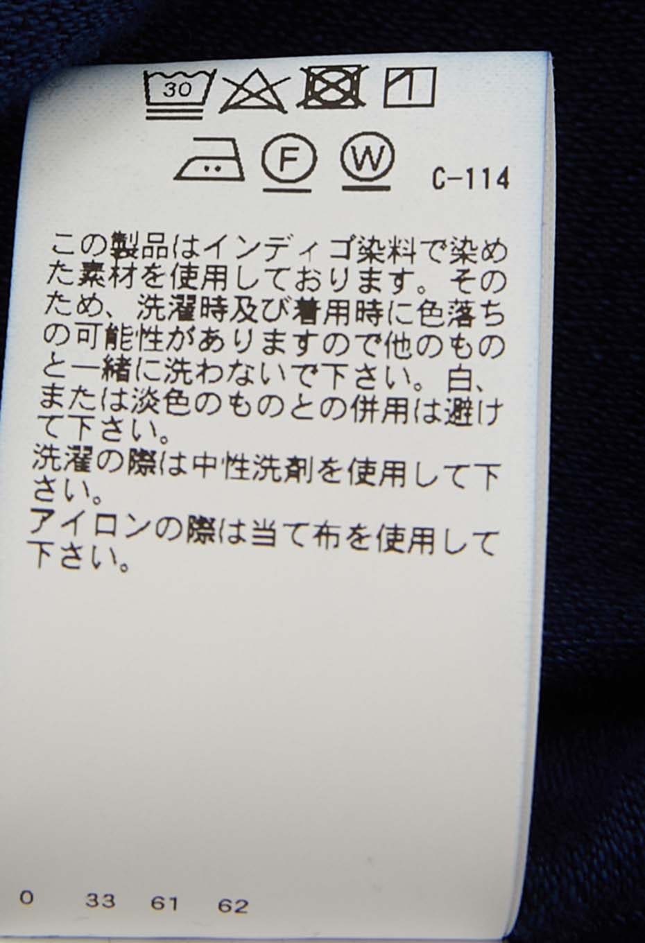 この製品は、インディゴ染料で染めた素材を使用しておりますので、繰り返し着たり、何度も洗濯することにより、濃いブルーから淡いブルーに移り変わっていきます。白又は淡色のものと組み合わせて着たり、重ね着をすると色が移りますので避けてください。洗濯の際は色が落ちますので単独洗いでお願いします。