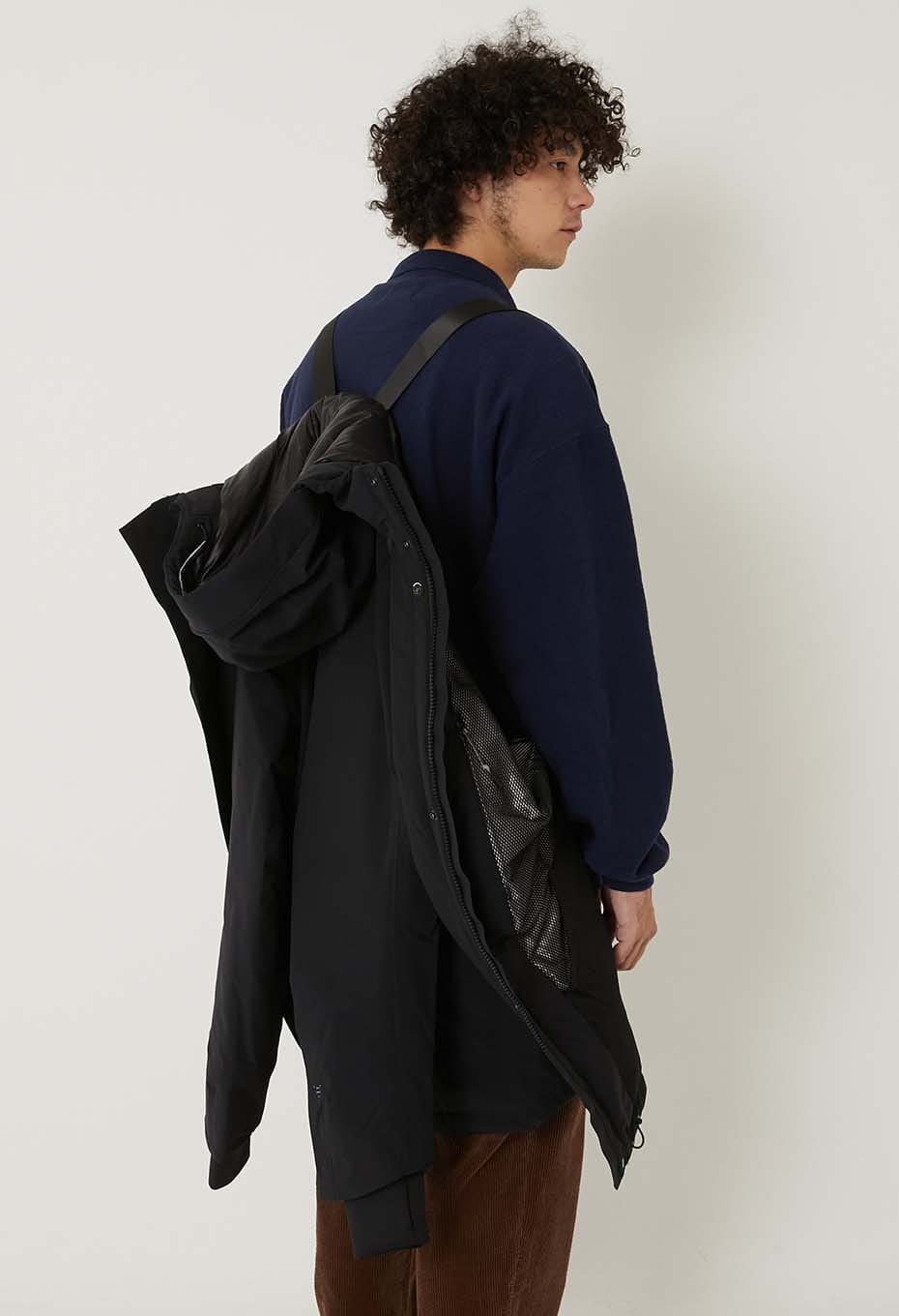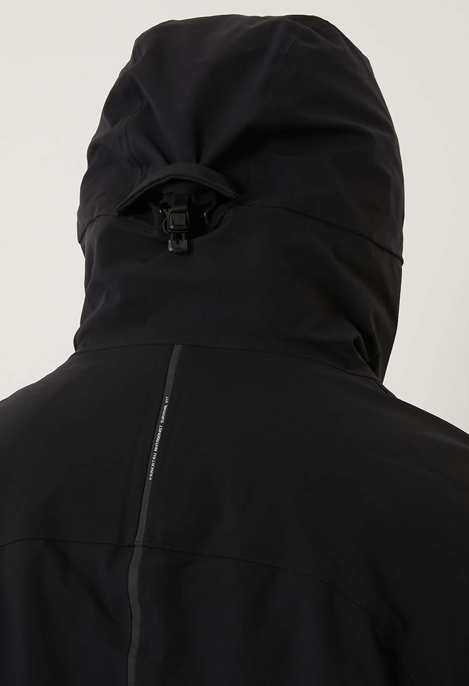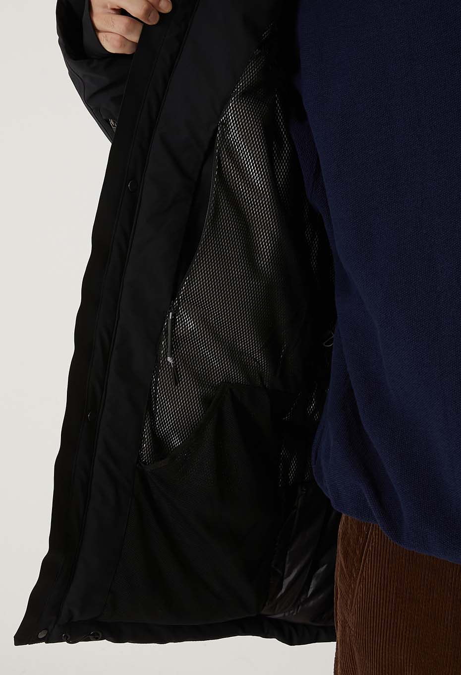 17,000mmの防水指数のメンブレンでラミネート加工されたソフト リサイクル3レイヤ―生地を使用したウィンターパーカー。再生プラスチックの断熱材と、保温性に優れたサーマルメッシュ生地の2種類の素材で作られた裏地を備えています。肩掛け用インナーストラップを装着しています。