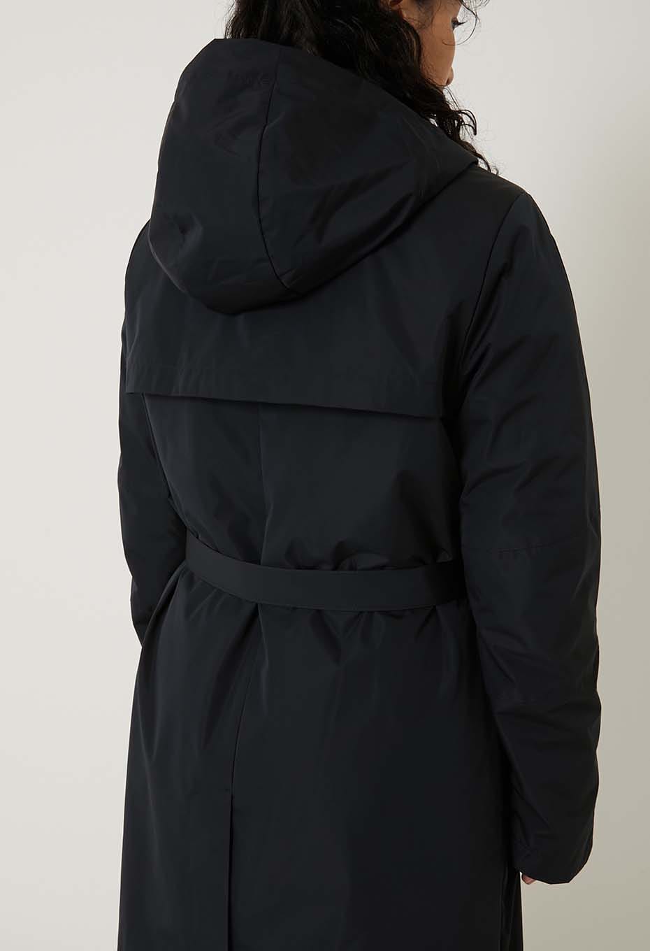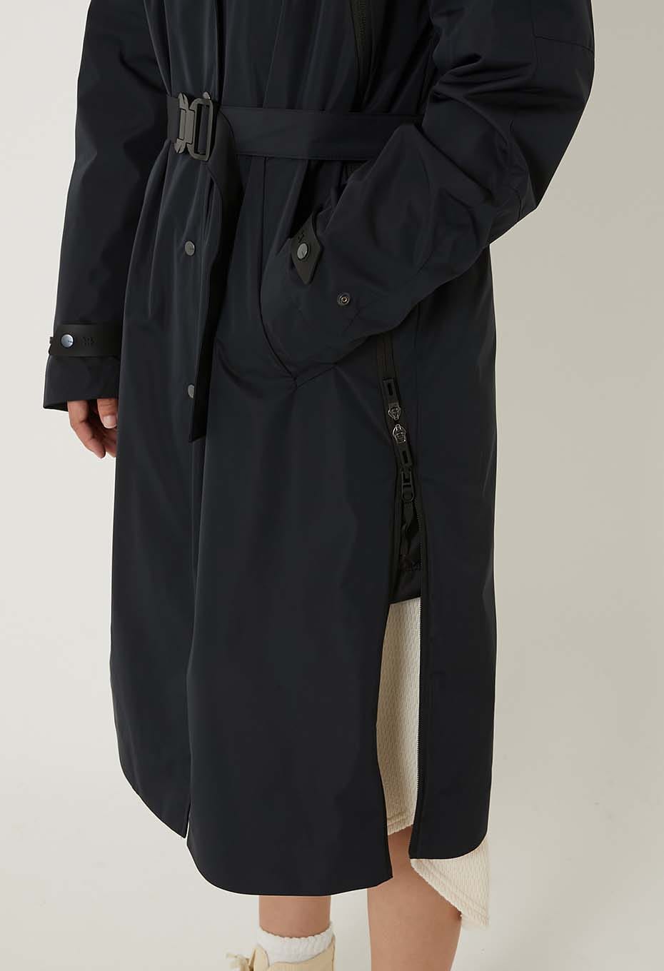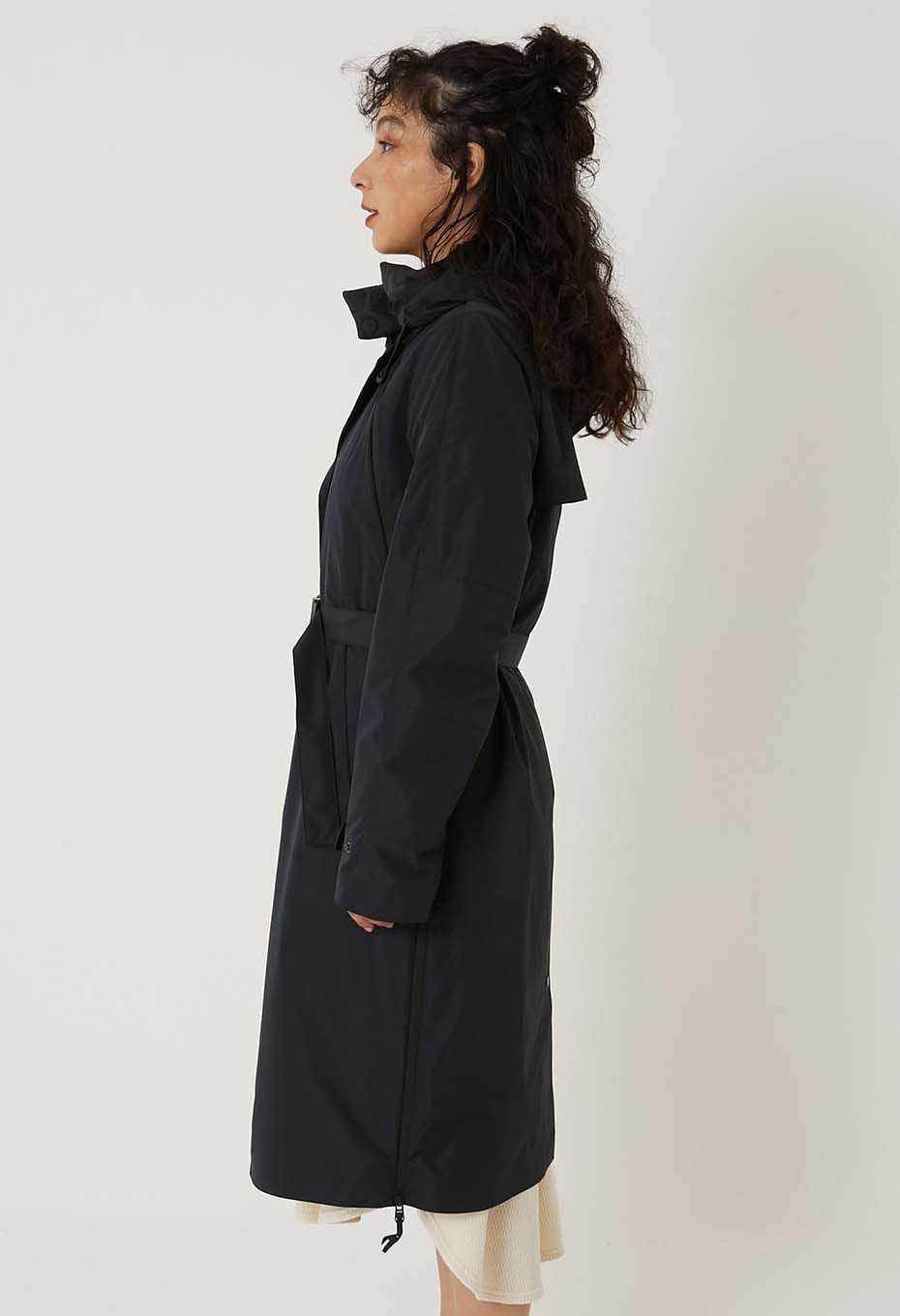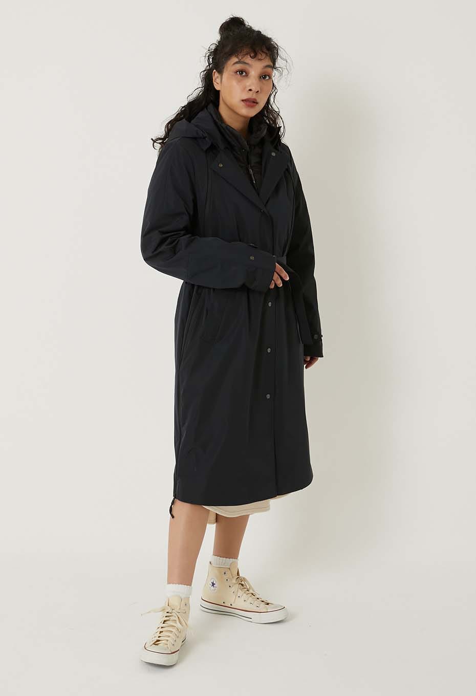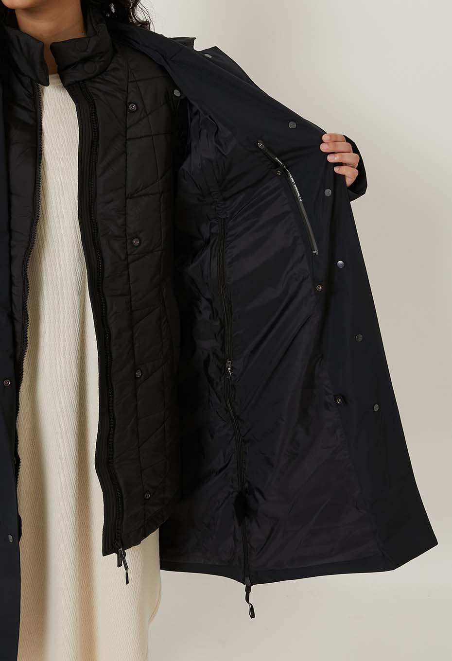 表地はメンブレン加工された防水、透湿性に優れた柔らかい生地で作られ、高性能撥水コーティングで強化された、防水性を備えたトレンチコートです。女性らしいすっきりしたシルエットを保ちながらも、取り外し可能なハイネックの防風フードと磁気フィッティングを備えることで極寒地でもスタイリッシュな印象を与えてくれます。別々に着用可能なインナージャケットで様々な環境で着用することができます。
