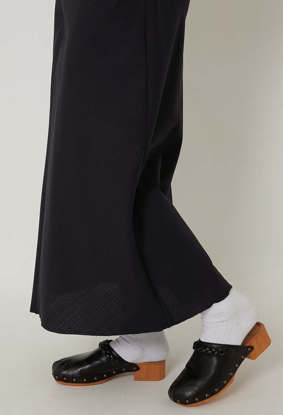 ステッチも極力少なくし、裾は断ち切り仕様で軽い仕上がり。ウエストの内側は織模様が入った生成りのスレーキをポイントに上品に仕立てています。