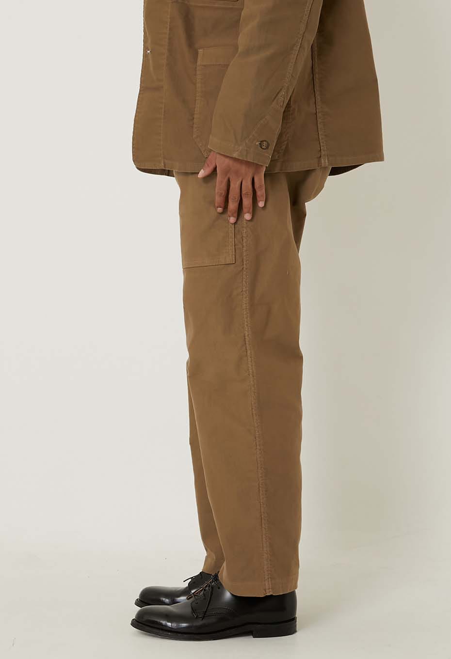 前身頃にアシメントリーなポケットを配置したワークパンツです。製品染めで仕上げることで、パッカリングが効いた古着のような雰囲気のあるパンツになっています。同生地のジャケット(1006558)とのセットアップのコーディネートもおすすめです。オリジナルのジャーマンクロスストレッチ生地の表面を起毛させ、モールスキンのような風合いになっています。