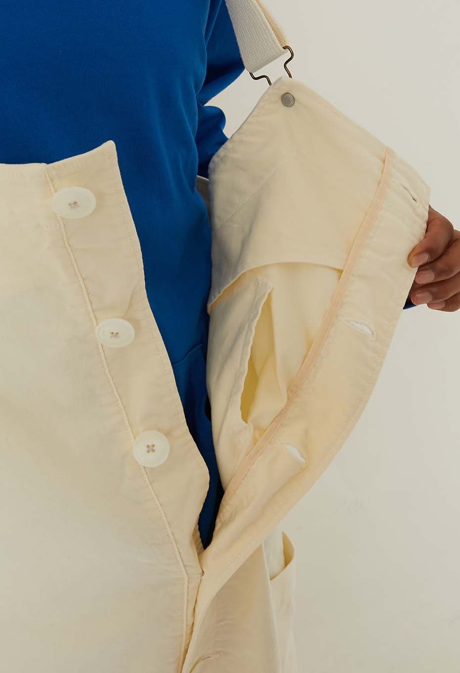 フロントのボタンで開閉する仕様となっており、着用時の雰囲気が抜群です。製品染めで仕上げることで、パッカリングが効いた古着のような雰囲気のあるオーバーオールになっています。