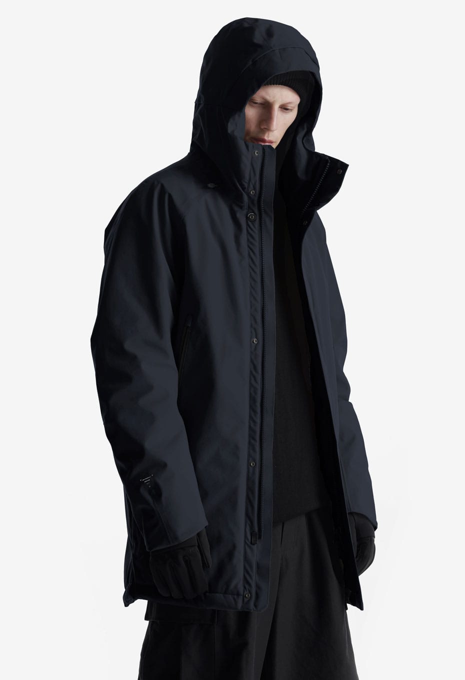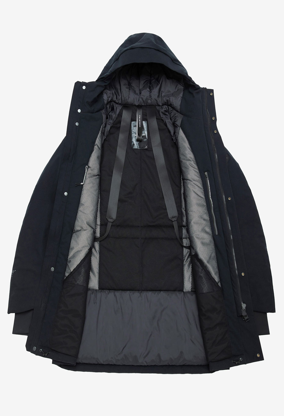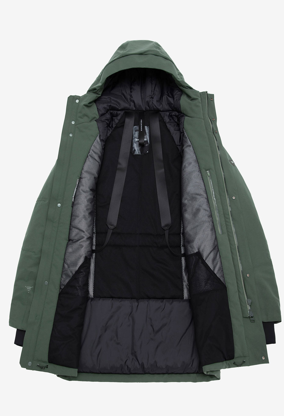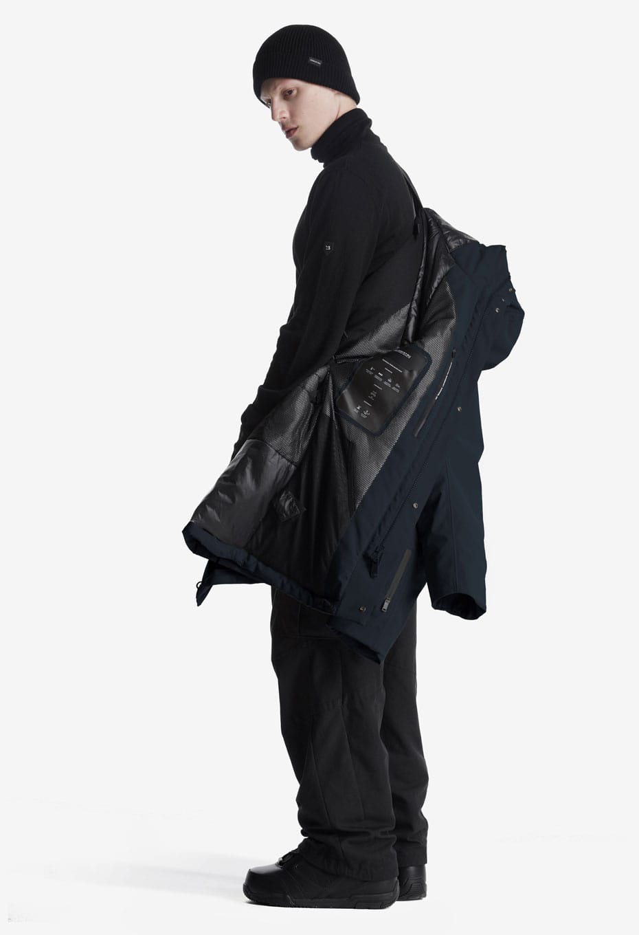 100%リサイクル・プラスチックの断熱材を使用し、バランスの取れた防寒機能を備えた裏地と、ジャケットを肩から提げるためのインナーストラップを備えています。
