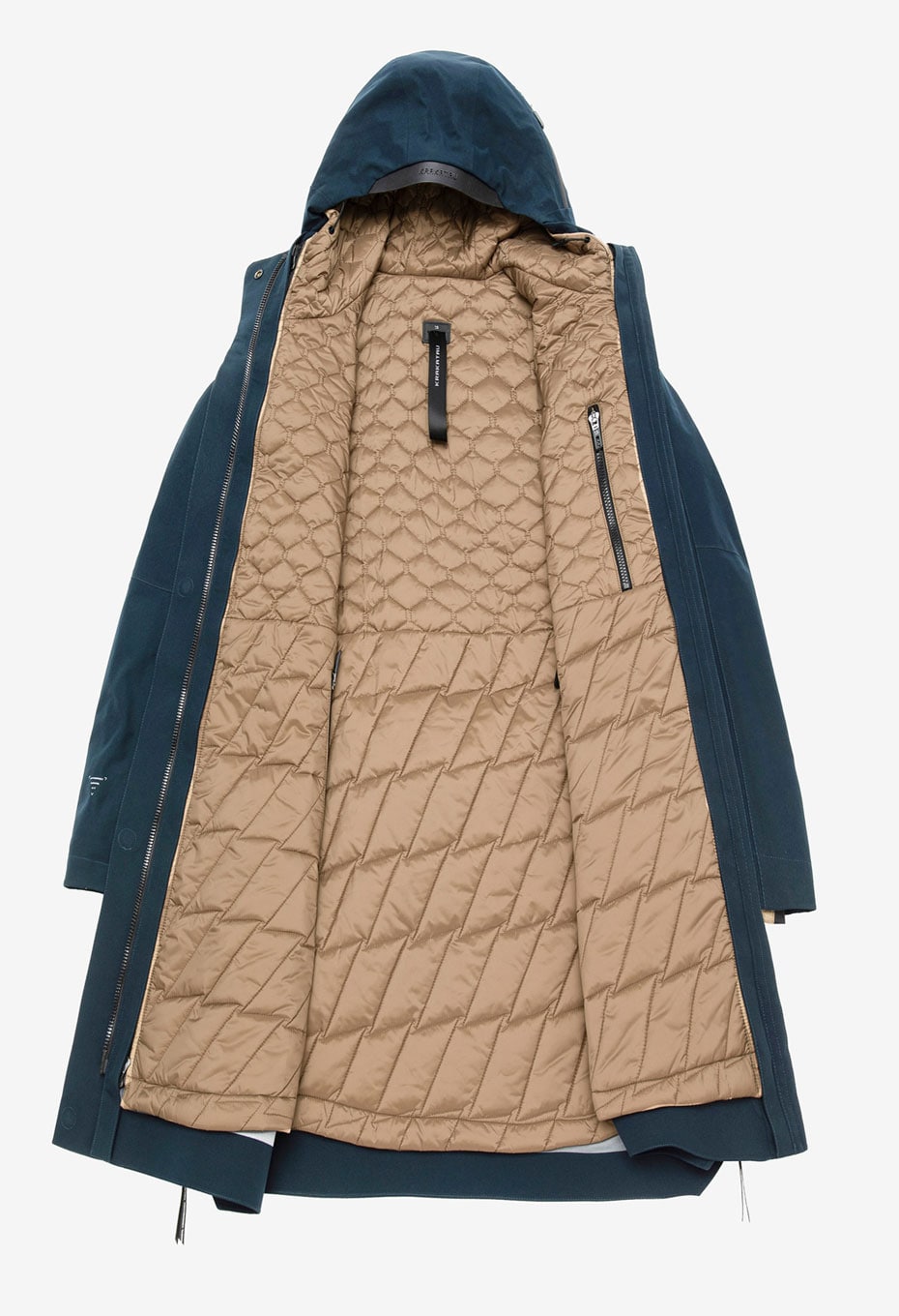 雨天時には防水レインコートとして、晴れた暖かい日にはキルティングジャケットとして、厳しい冬には両方のジャケットを同時に着用できる3way仕様になります。
