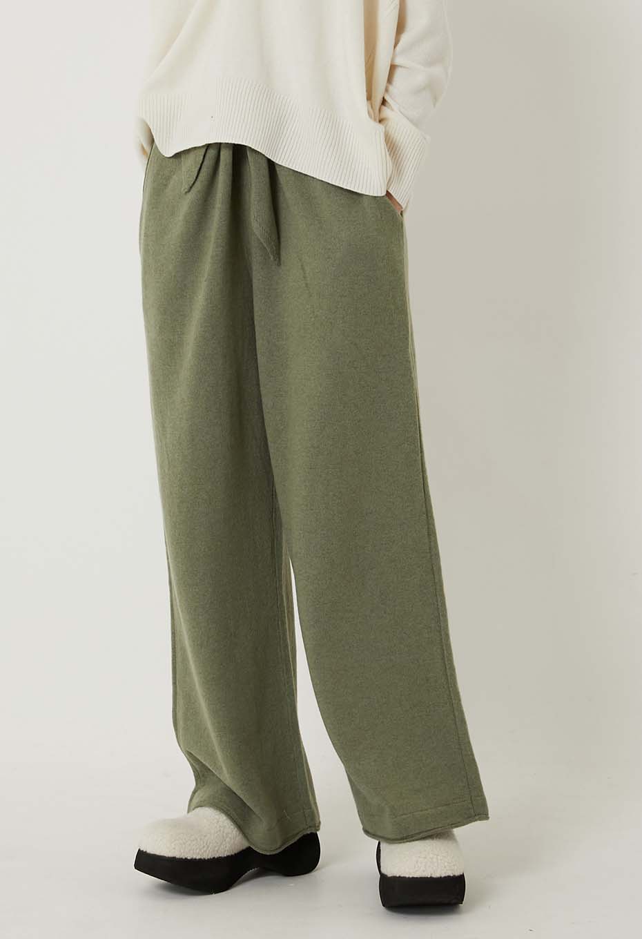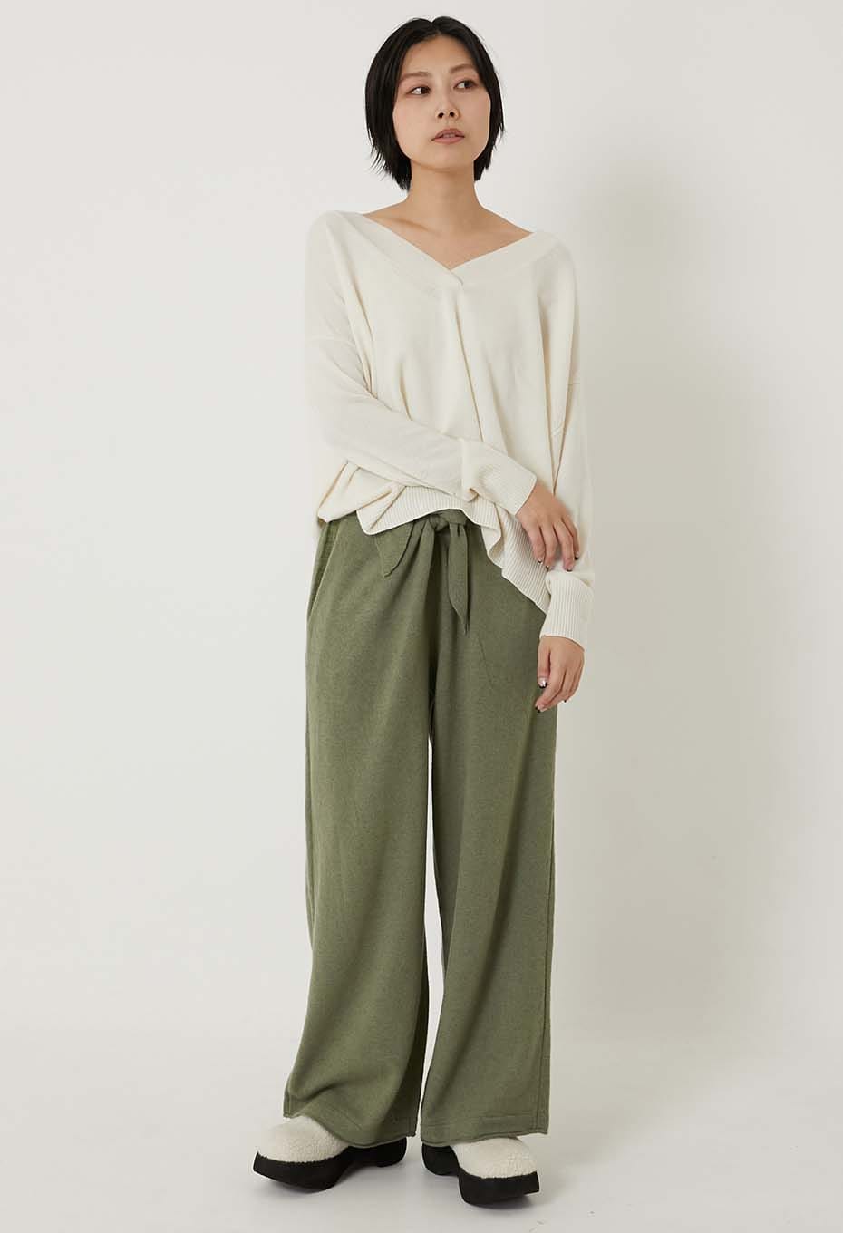 - カシミヤ100%で作られた新しいニットパンツ。ウエストで結ぶリボンがいいアクセントになっています。