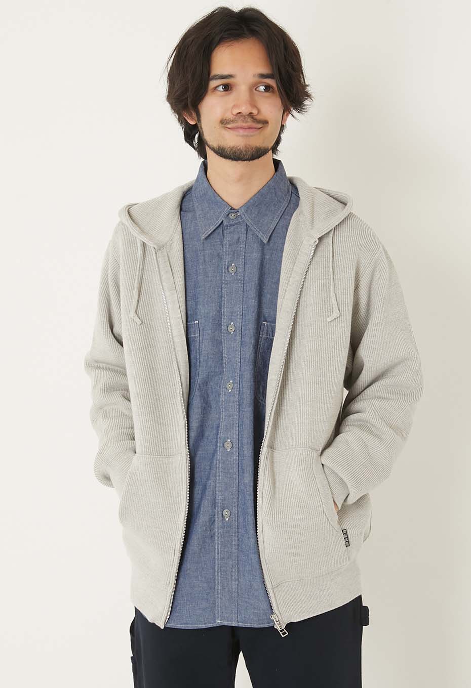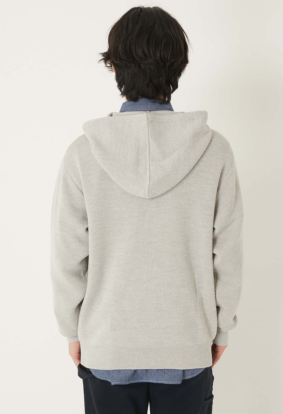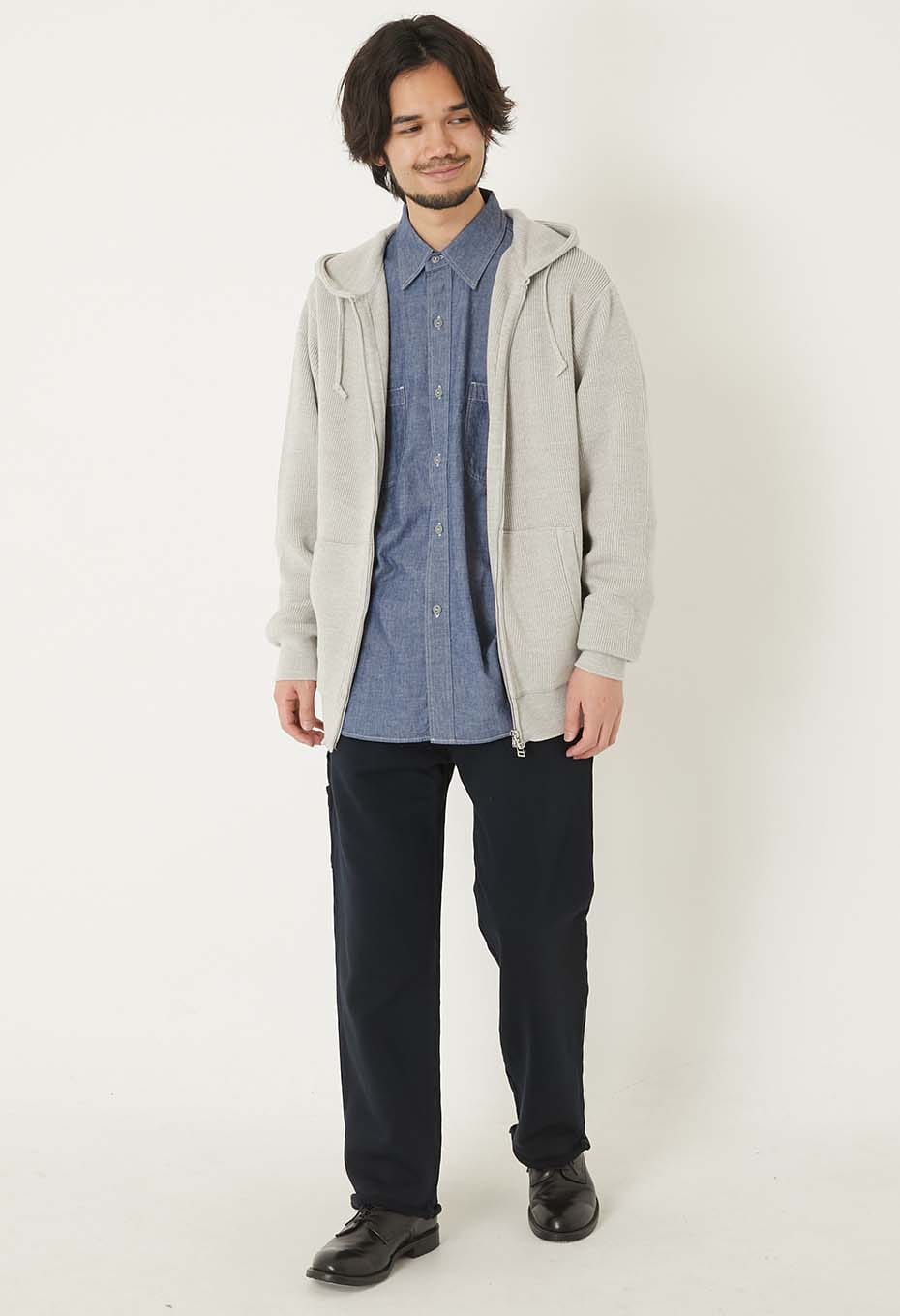程よいゆとりのレギュラーフィットで、着こなしの幅が広がる一着です。ヴィンテージのスウェットパーカーのように畦編みにすることでヴィンテージと綺麗なセーターの中間のようなミックス感が生まれました。スウェットのパーカーでは少しカジュアルすぎると感じる方におすすめです。