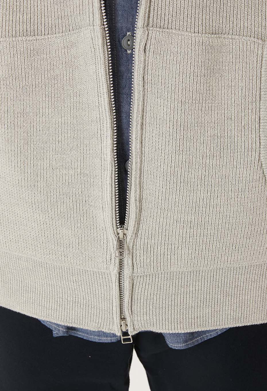 コットン糸とウール糸を撚り合わせた糸を、3本撚り合わせ畦編みにした素材を使用しました。ウールの膨らみ、コットンの肌触りの良さがバランス良くミックスされ、セーターのような上品さとスウェットのようなカジュアルさを持っています。家庭での手洗いが可能です。