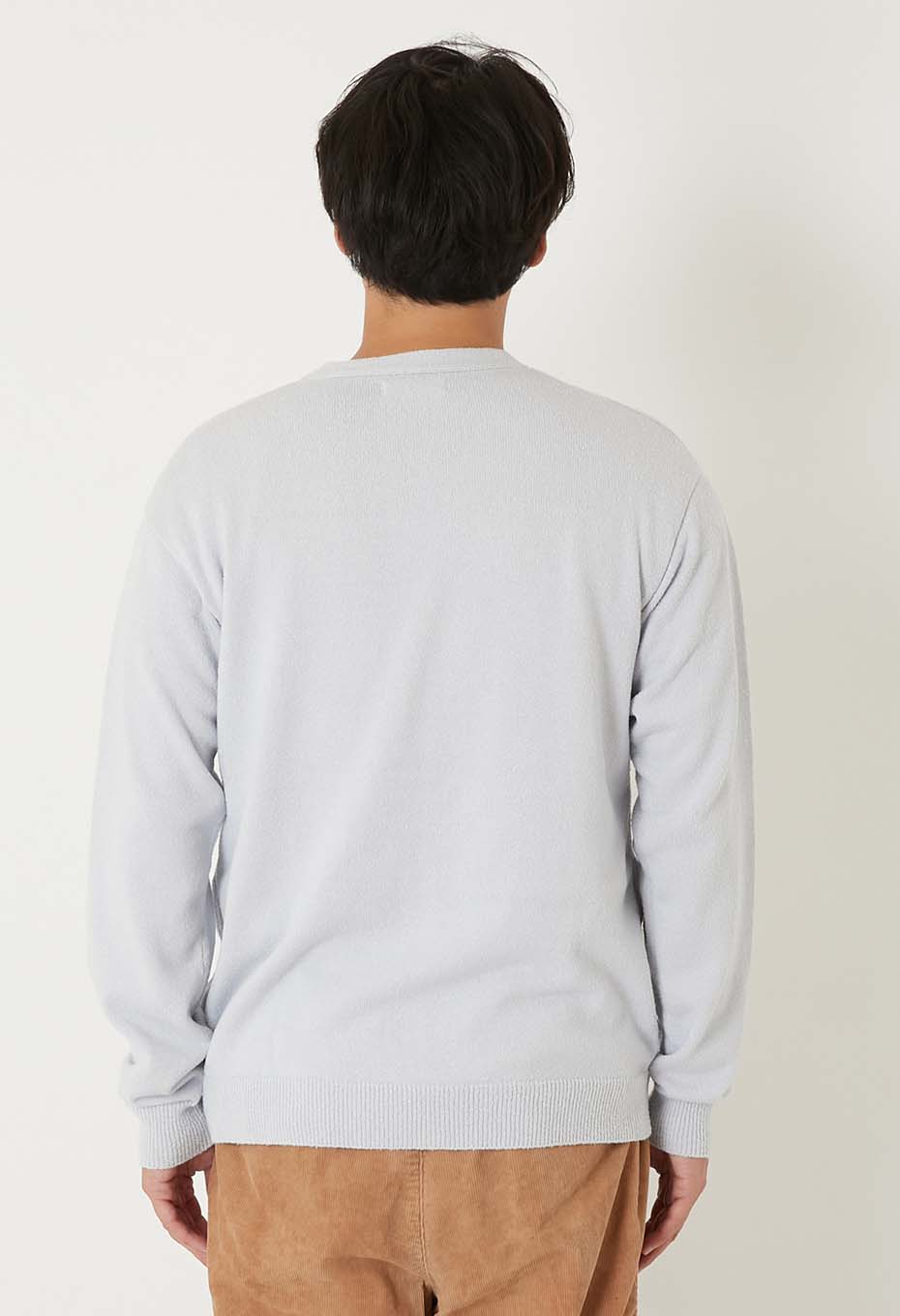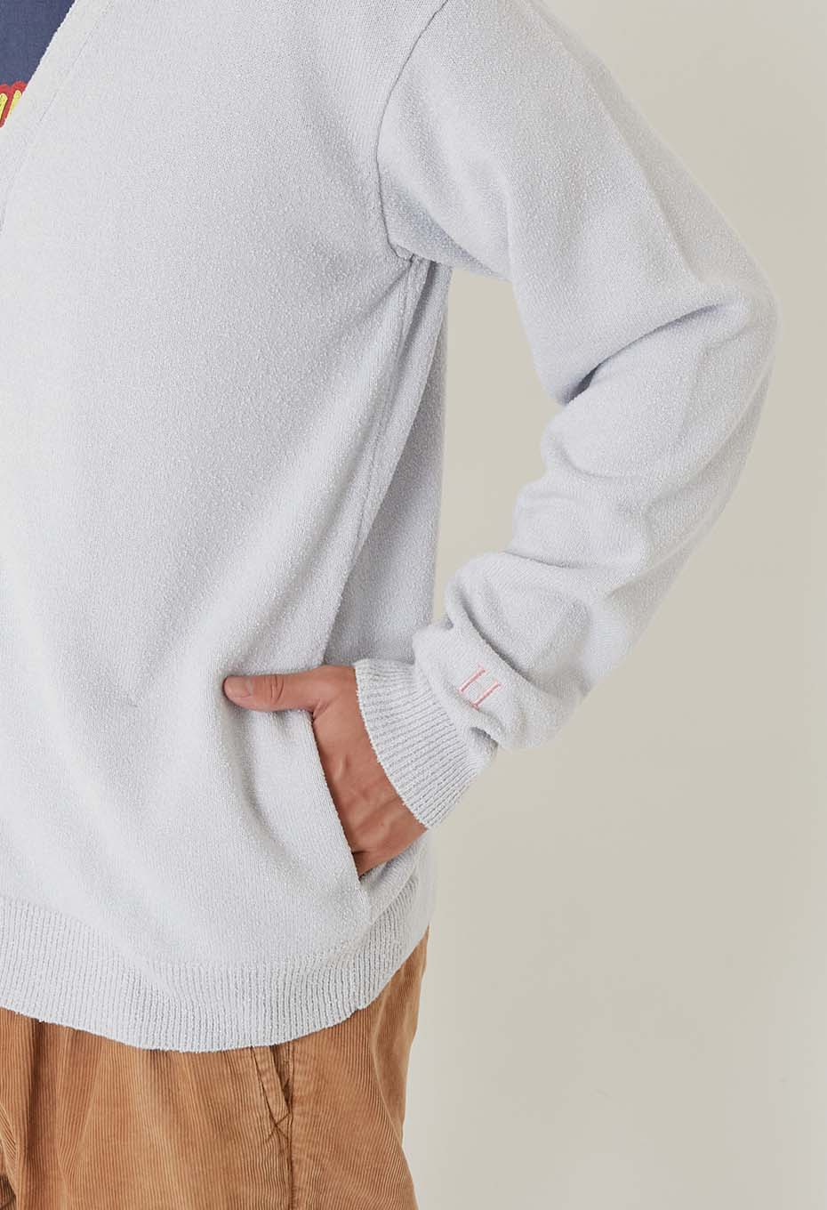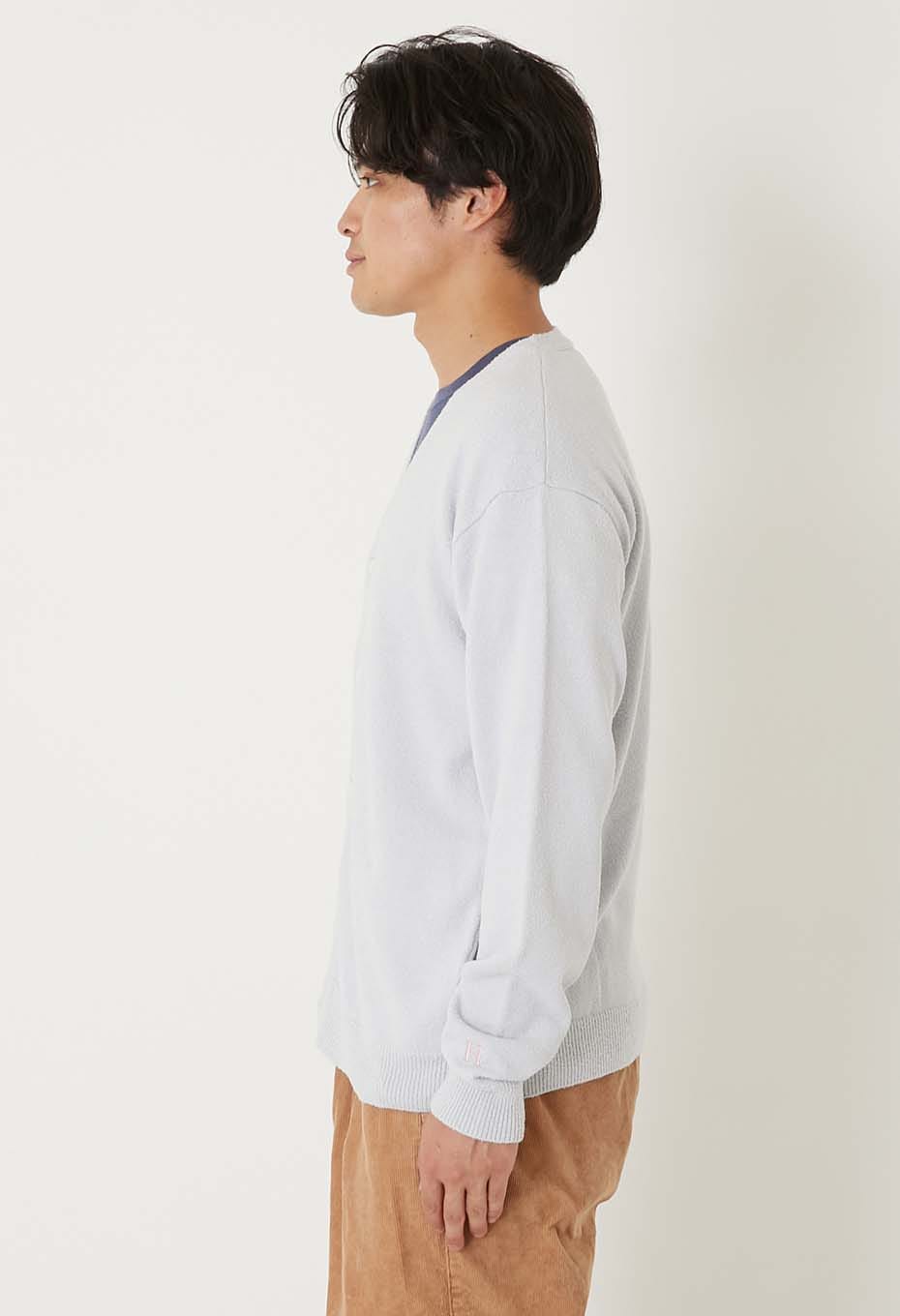 表はコットン、裏はループヤーンを使用し、二重編み組織で構成されたオリジナルニット生地。裏糸のループが柔らかなタッチとなり着心地の良さが際立ちます。また、表と裏の糸色を少しだけぶらすことで表面に奥行のある色が表現されています。