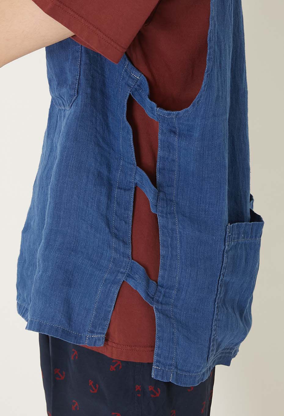 BLUE BLUEオリジナルの先染めインディゴリネンツイル生地を使用したベストです。他にはないリネンの風合いが魅力。