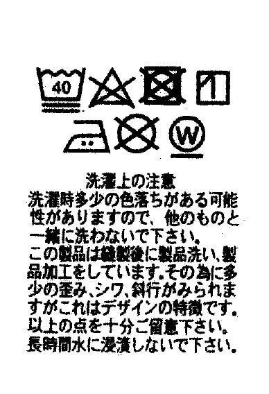 この製品は、インディゴ染料で染めた素材を使用しておりますので、繰り返し着たり、何度も洗濯することにより、濃いブルーから淡いブルーに移り変わっていきます。白又は淡色のものと組み合わせて着たり、重ね着をすると色が移りますので避けてください。洗濯の際は色が落ちますので単独洗いでお願いします。また、保管の際は光が当たらないように気を付けてください。また、折りたたんだ状態で放置すると、折り目が退色することがあります。