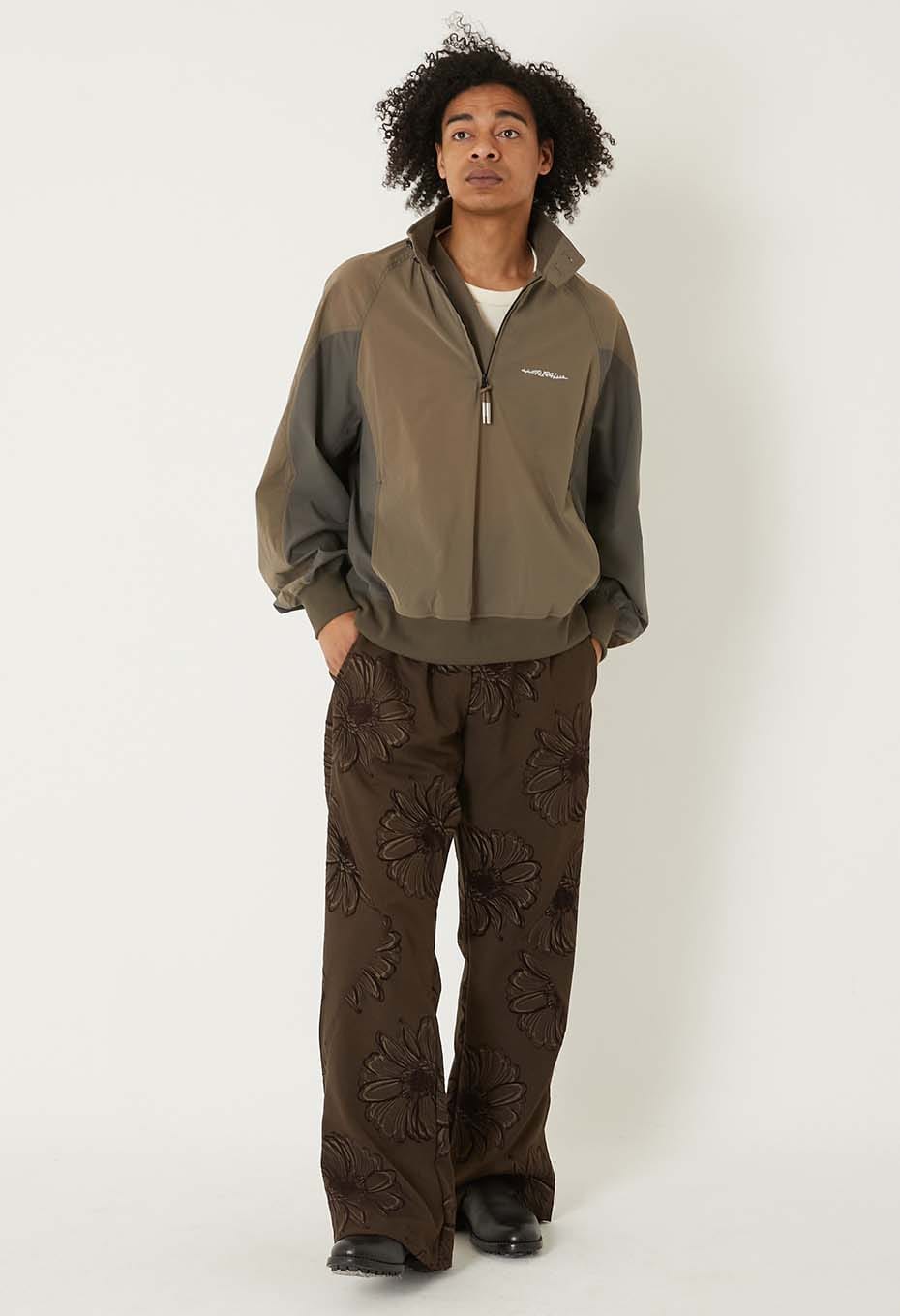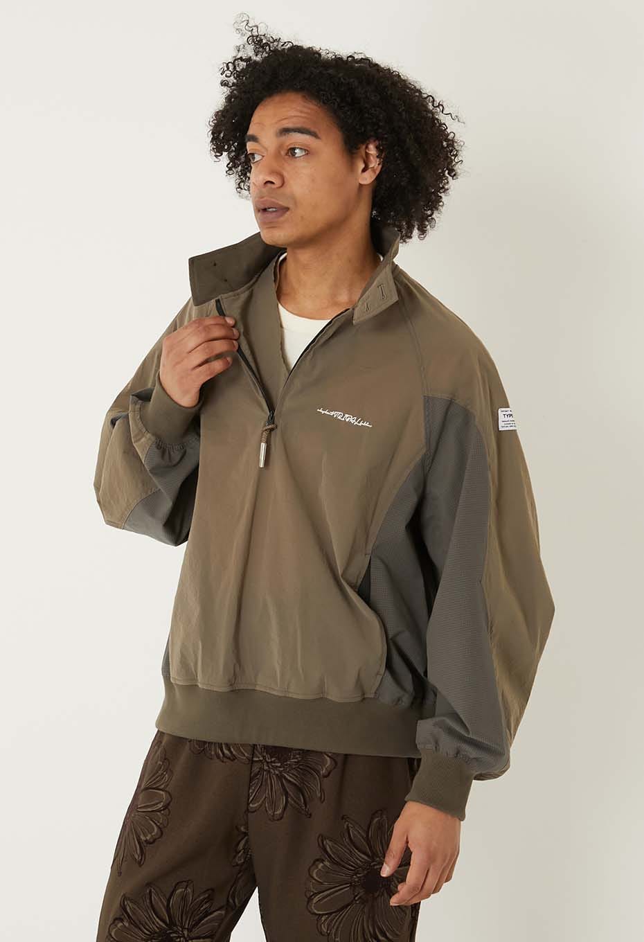 - G-9ジャケットとウォーミングアップスーツをドッキングしたアイテムです。生地には、非常に薄くて軽量で接触冷感機能、撥水機能を持ち、想像以上の優れた申縮性のあるハイパワーストレッチナイロンを使用しています。倍近い幅の生地を縮め作り上げることで、独特なハリコシのあるペーパーライクな生地に仕上げました。身幅が広めに設定されたボックス型のルーズシルエットです。前袖切り替え部分をカモメ型にパターンメイクし、柔らかな印象に仕上げました。ファスナー引手にはレザーのドローコードを、裾部分にはドローコードを配置しておりシルエットの変更が可能です。フロント中央には、ベンチレーションとしての機能を持たせたメッシュポケットが付いています。