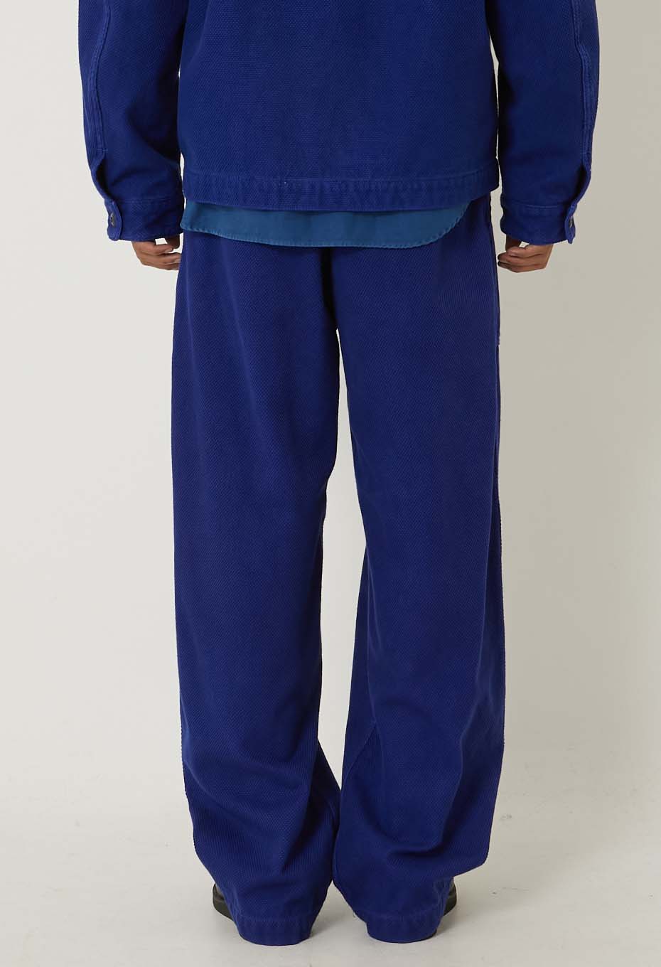 もともと道着などのために作られた刺し子素材を使用しており、BLUE BLUE JAPANの数ある刺し子シリーズの中でも、最もわかりやすい刺し子素材と言えます。頑丈ながらも柔らかく仕上げられており、美しいフォルムを作り出します。生成色のこの生地を使い、製品化後に一点ずつ職人の手でユーロワークブルーの色をインディゴで染め上げています。