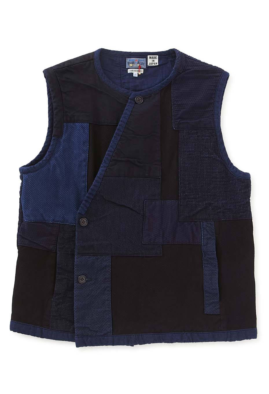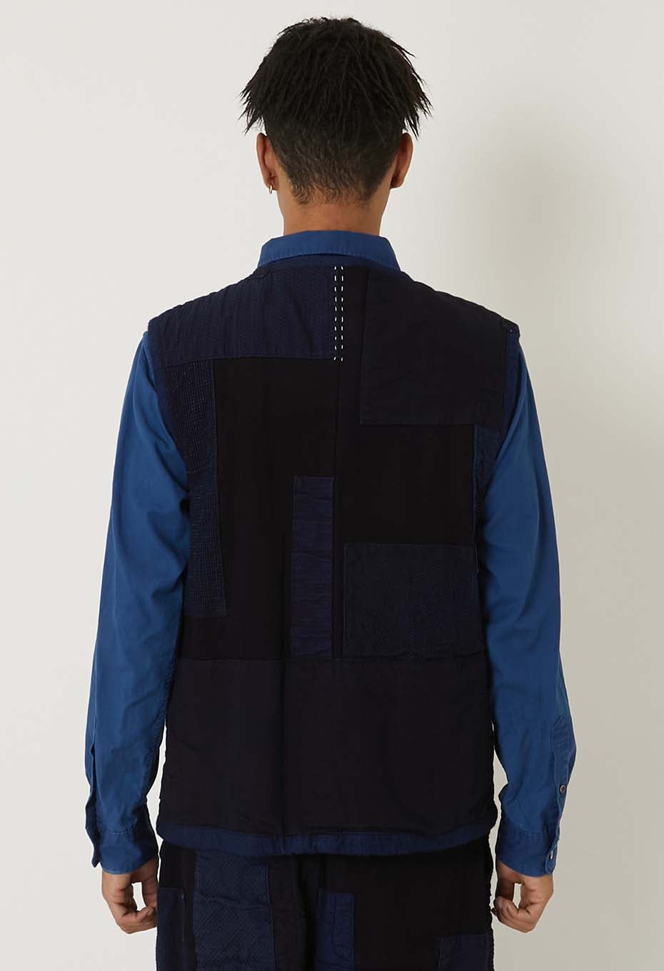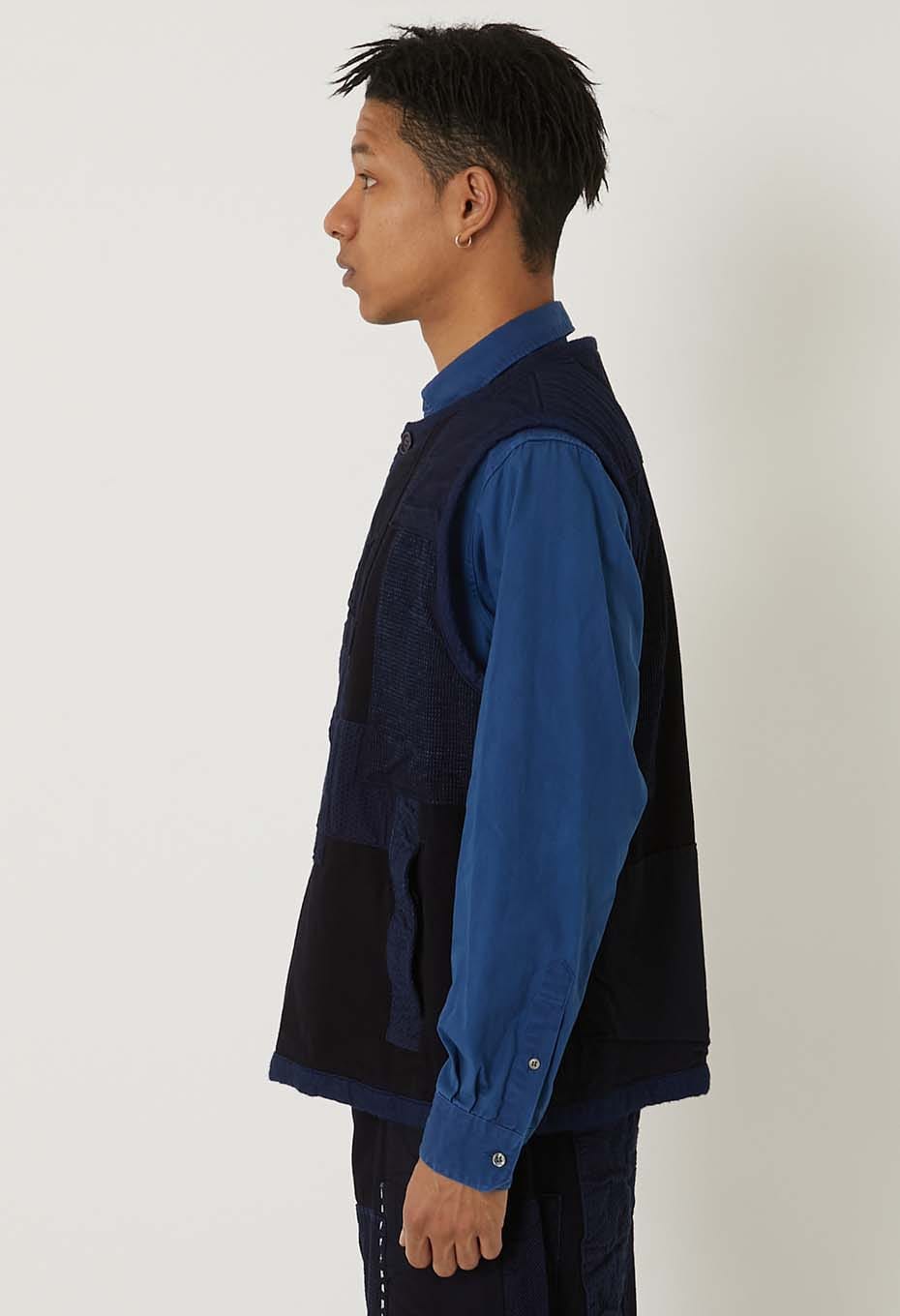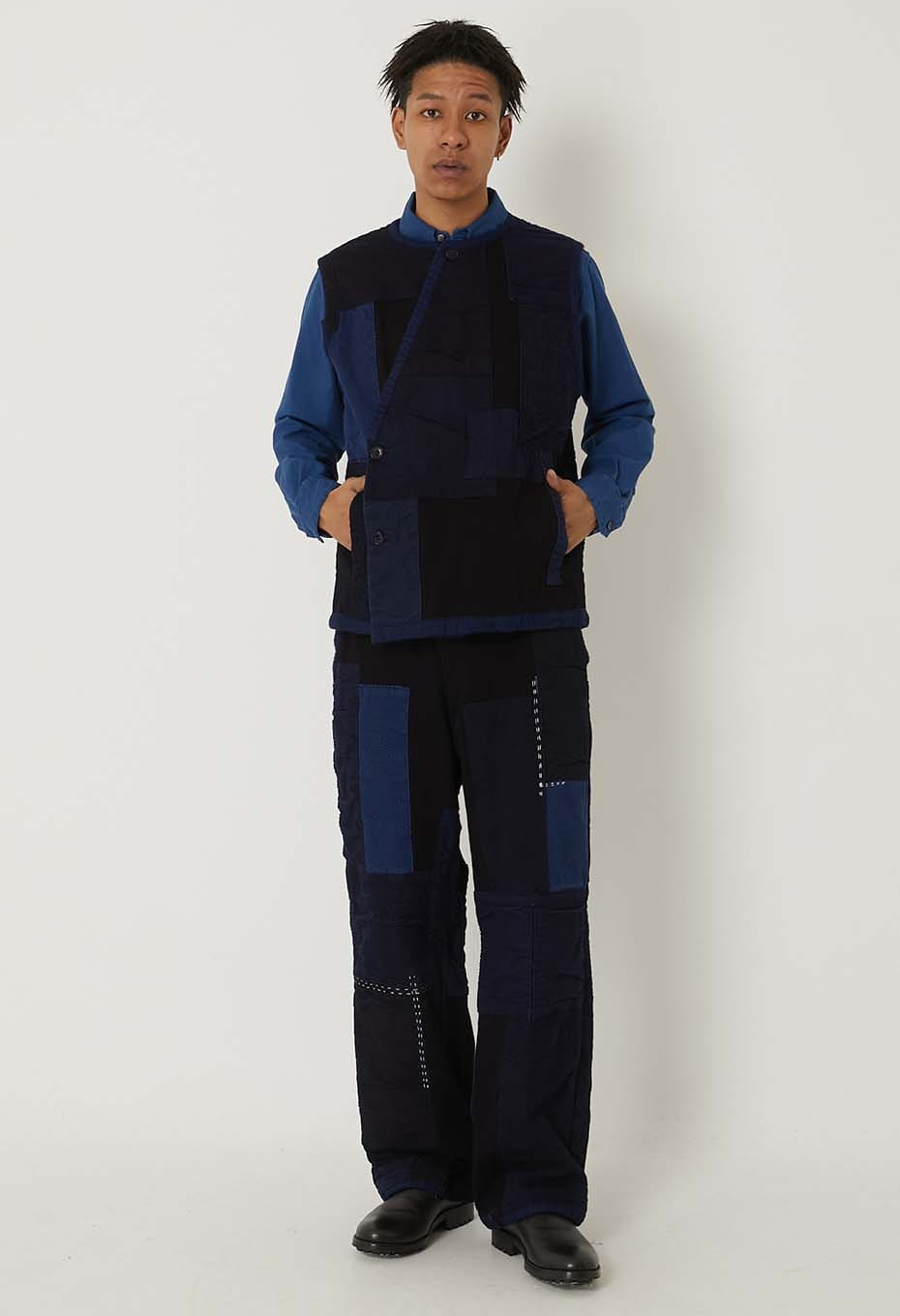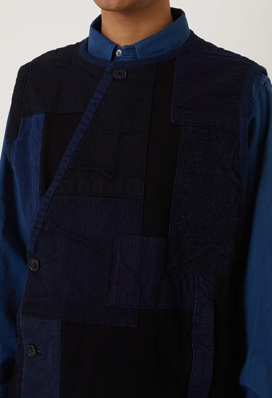本藍染めを施した刺し子生地に、様々な表情のインディゴカラーの生地を重ね、手刺しで縫い込んだクルタスタイルベストです。