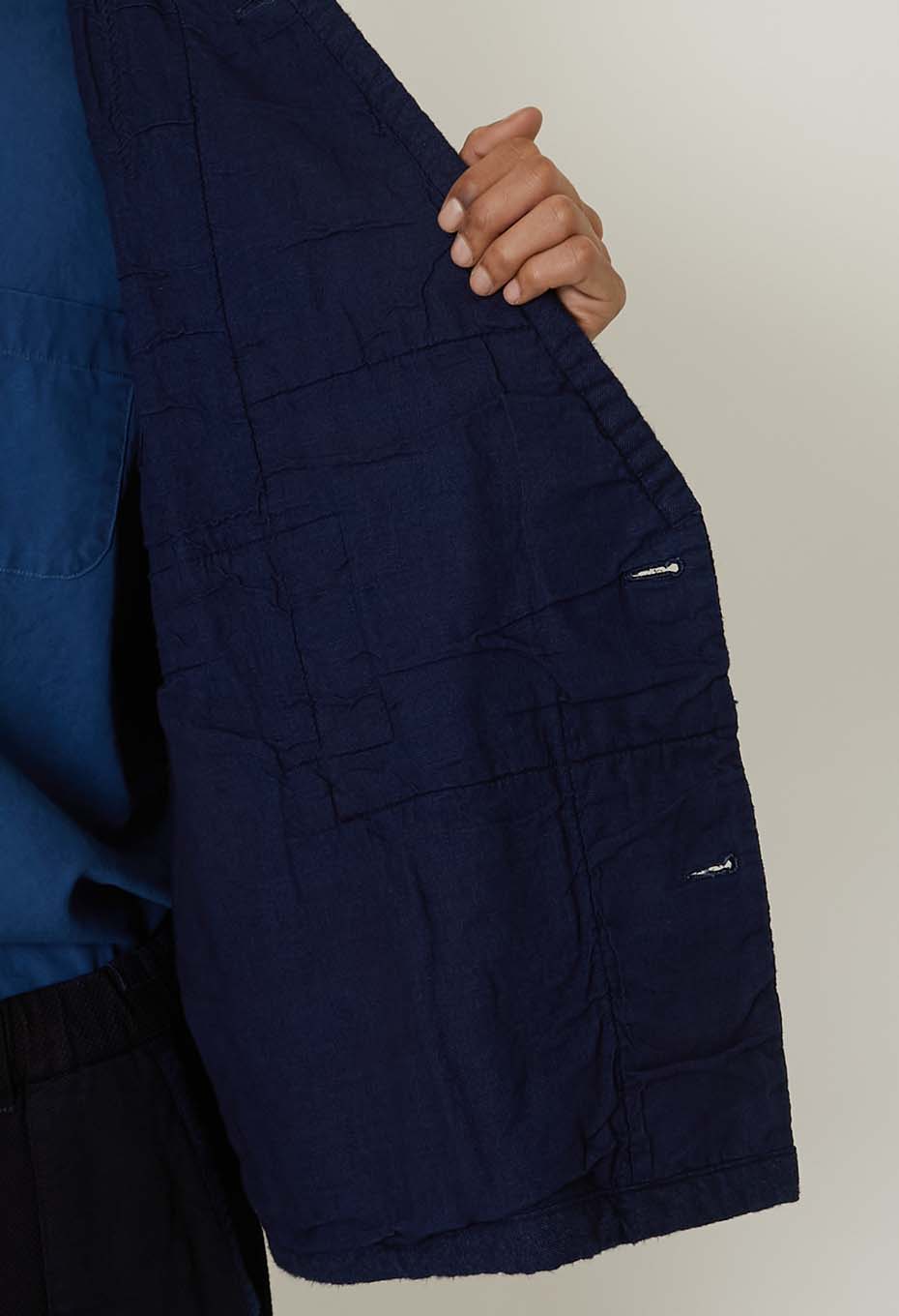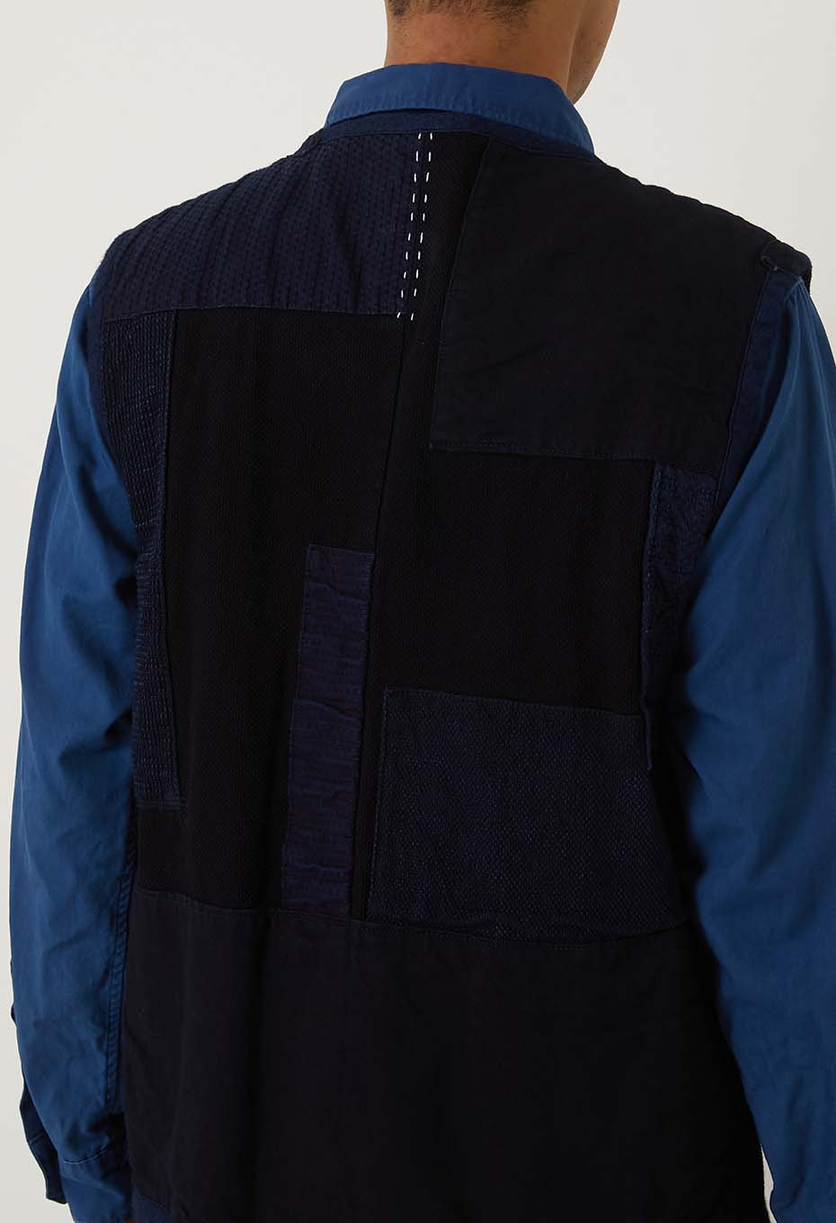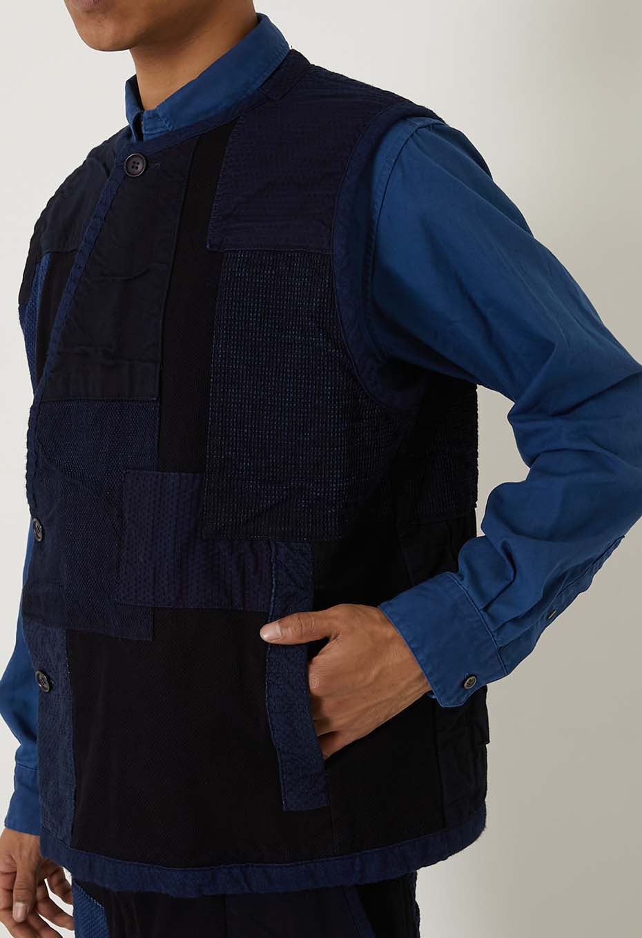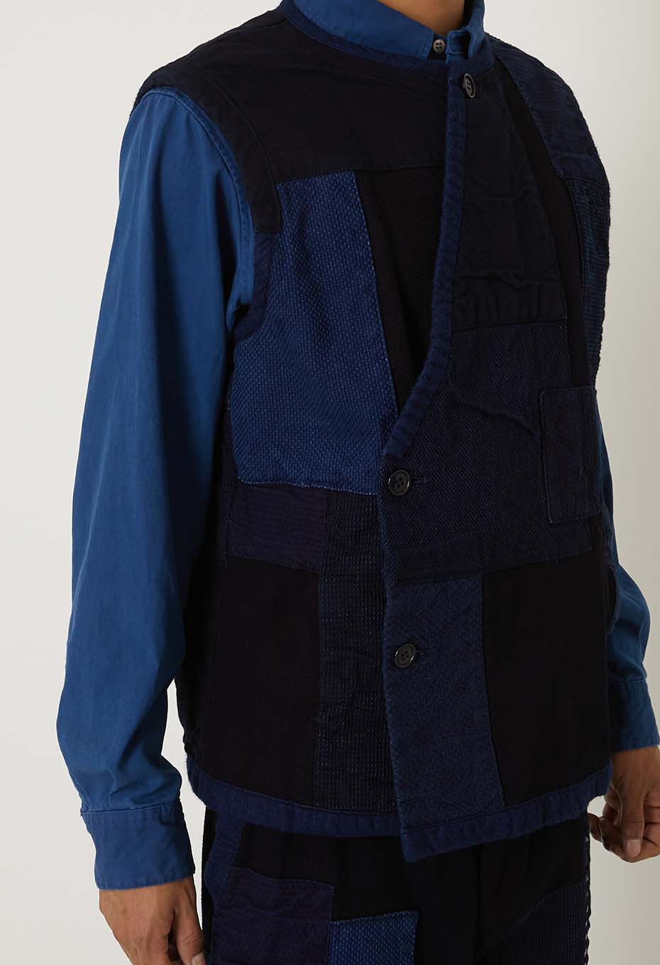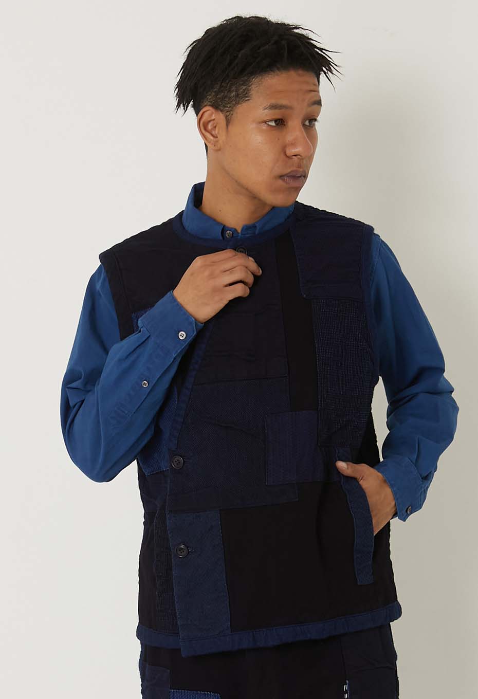 本藍染めを施した刺し子生地に、様々な表情のインディゴカラーの生地を重ね、手刺しで縫い込んだクルタスタイルベストです。