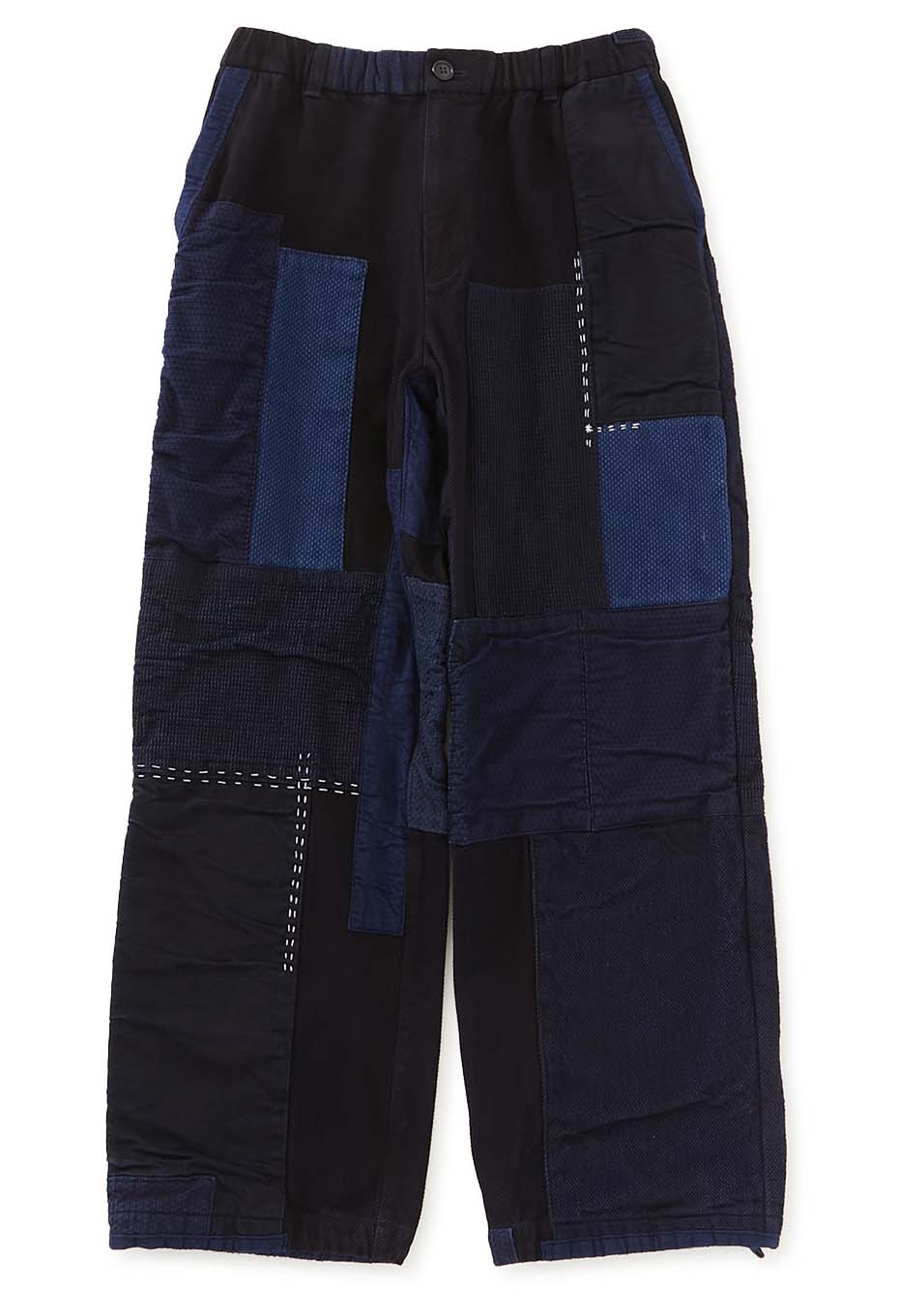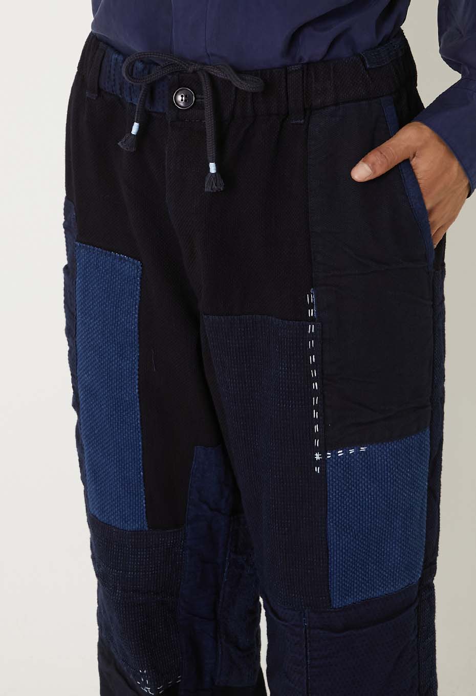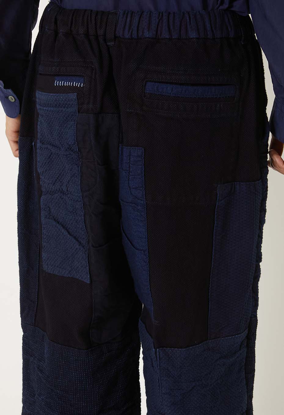 本藍染めを施した刺し子生地に、様々な表情のインディゴカラーの生地を重ね、手刺しで縫い込んだイージーパンツです。