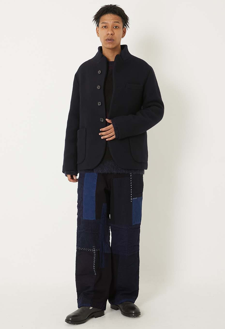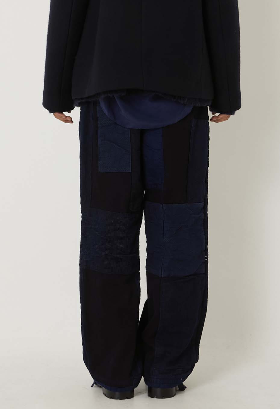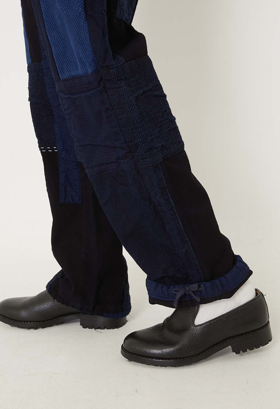 本藍染めを施した刺し子生地に、様々な表情のインディゴカラーの生地を重ね、手刺しで縫い込んだイージーパンツです。
